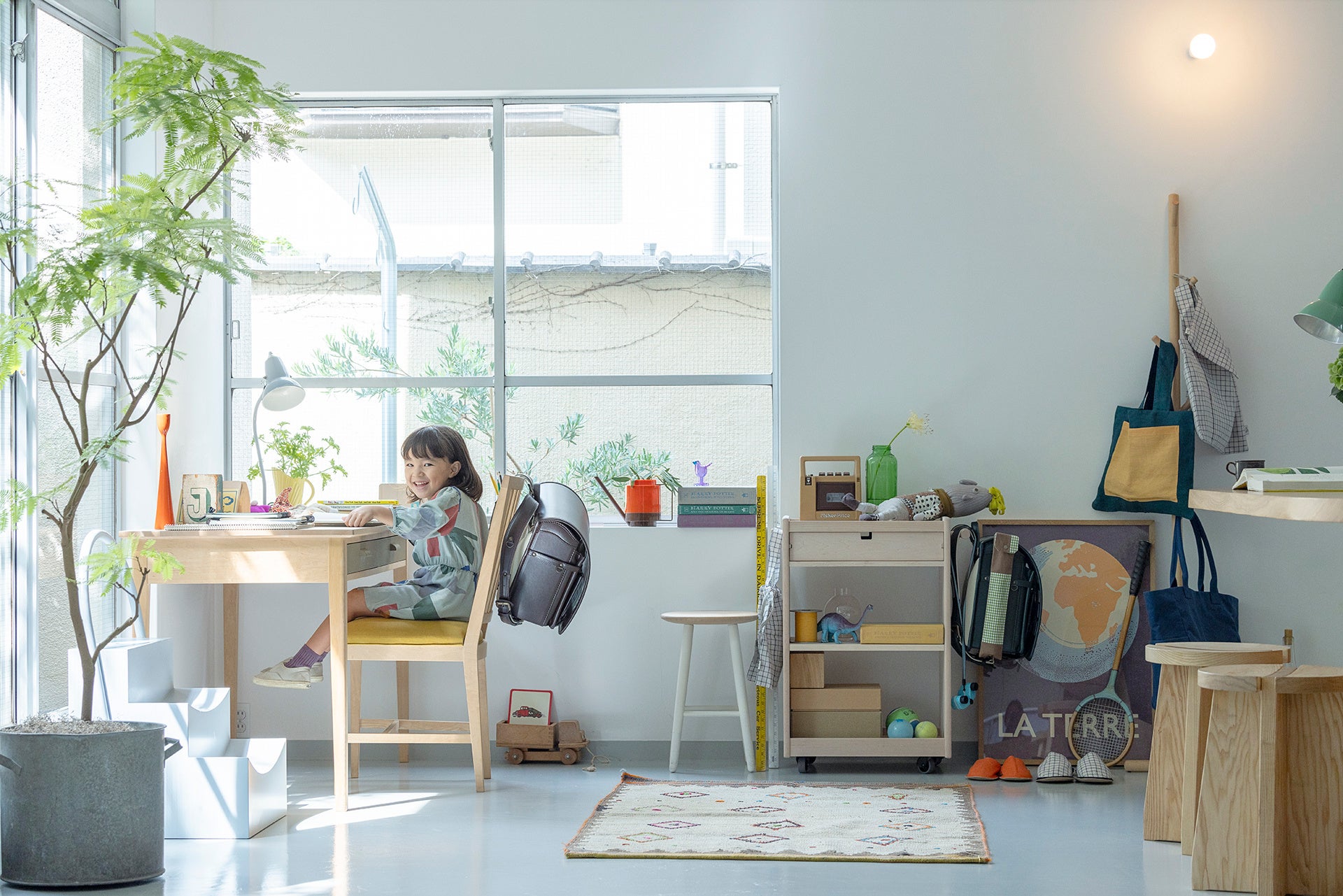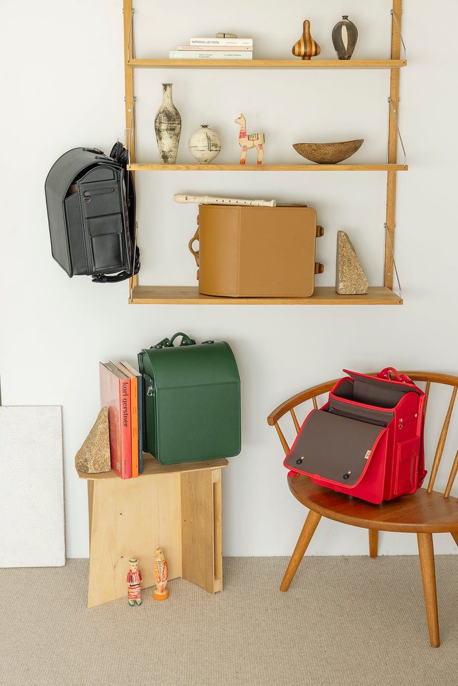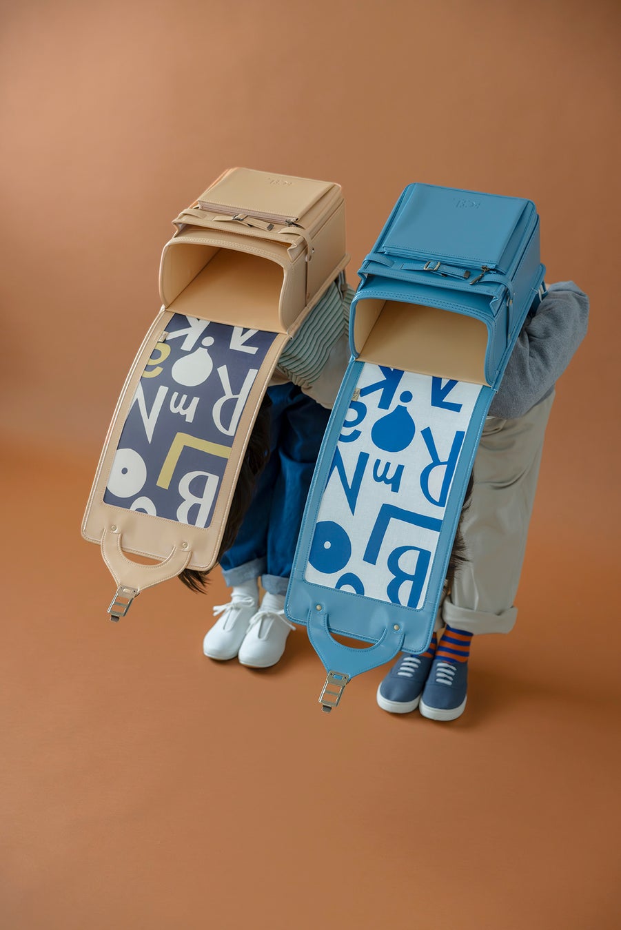 プロダクトデザイナー、柴田文江さんが手がけた、まったく新しいデザインのランドセルです。今一度ランドセルをカバンとして捉え直し、上部を開閉口としました。そのため低学年でも開け閉めしやすく、荷物も取り出しやすくなっています。 また「かぶせ」がないために軽量で、それでいて一目でランドセルとわかる四角い形に仕上げてあります。定番の4色に加えて、新色のボルドー、ネイビーに合わせ、背面にはそれぞれ柴田さんオリジナルのチェック柄があしらわれています。