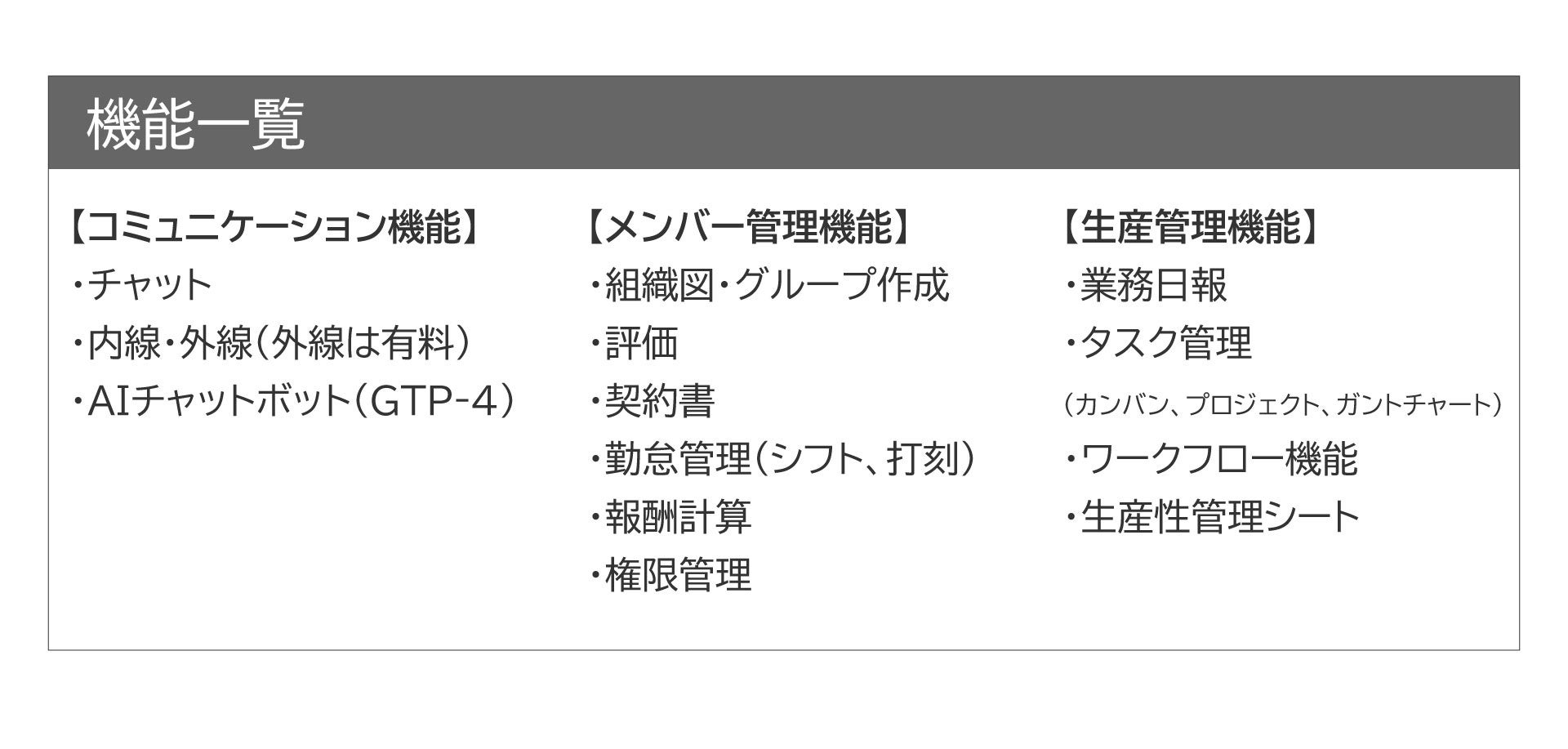 「MEMBER-S」では、スタッフ同士のコミュニケーションを図る「チャット」のほか、「タスク管理」、「業務日報」、「勤怠管理」、「生産性管理シート」、外線も内線もできる「電話の受発信」(外線機能のみ有料)などの機能が使えます。こうした機能に加え、OpenAI社の「GPT-4」の連携など随時機能を拡充しています。
