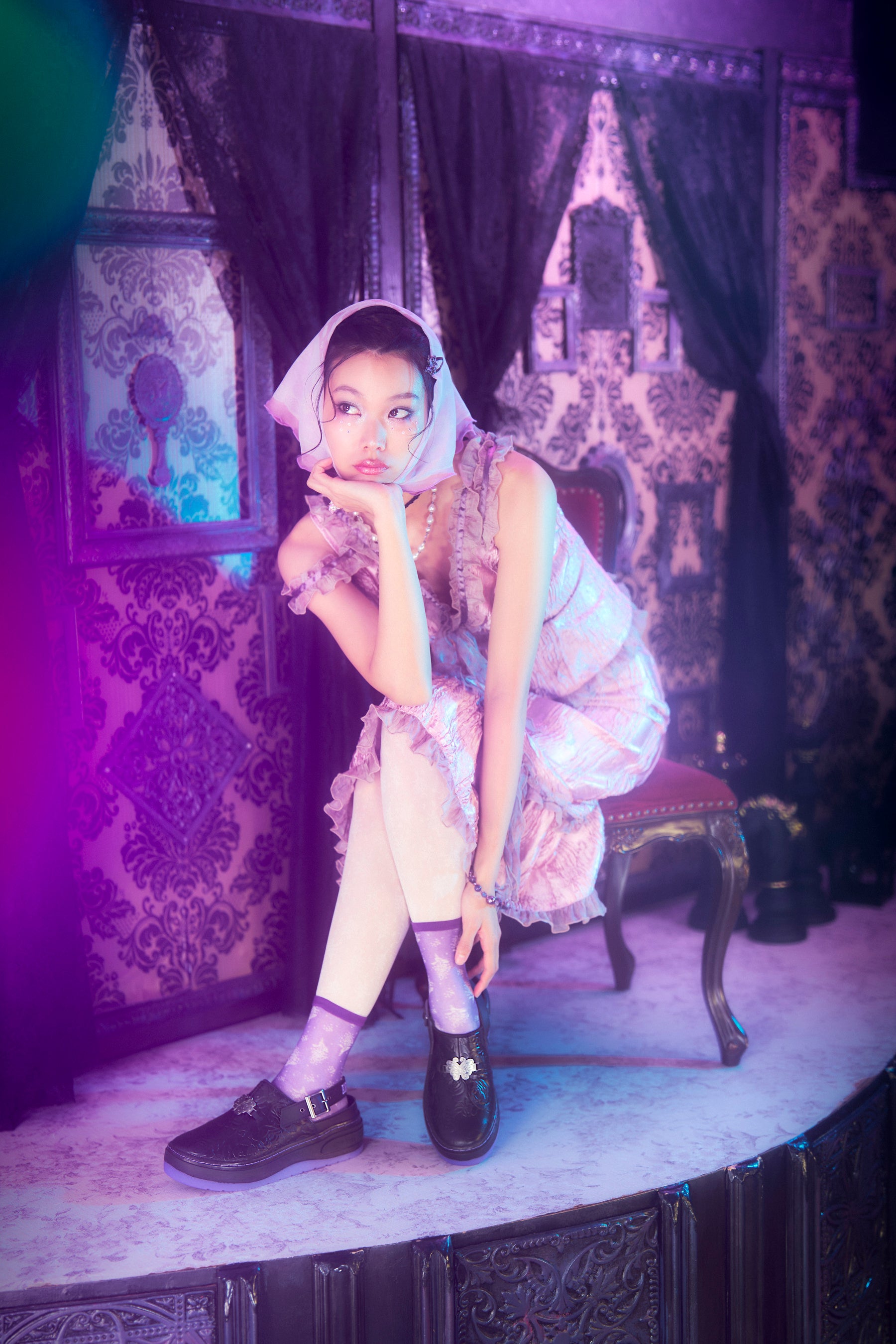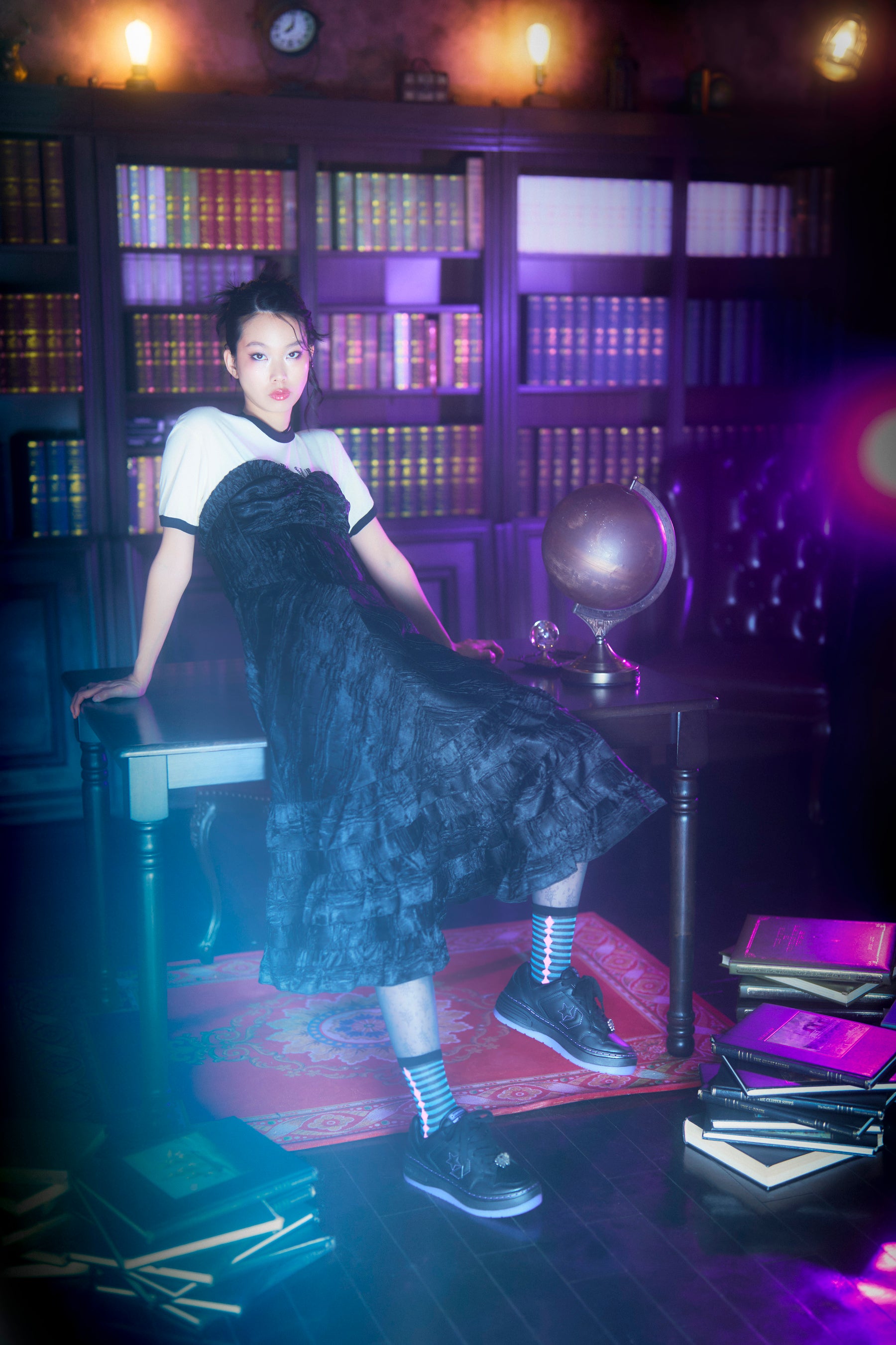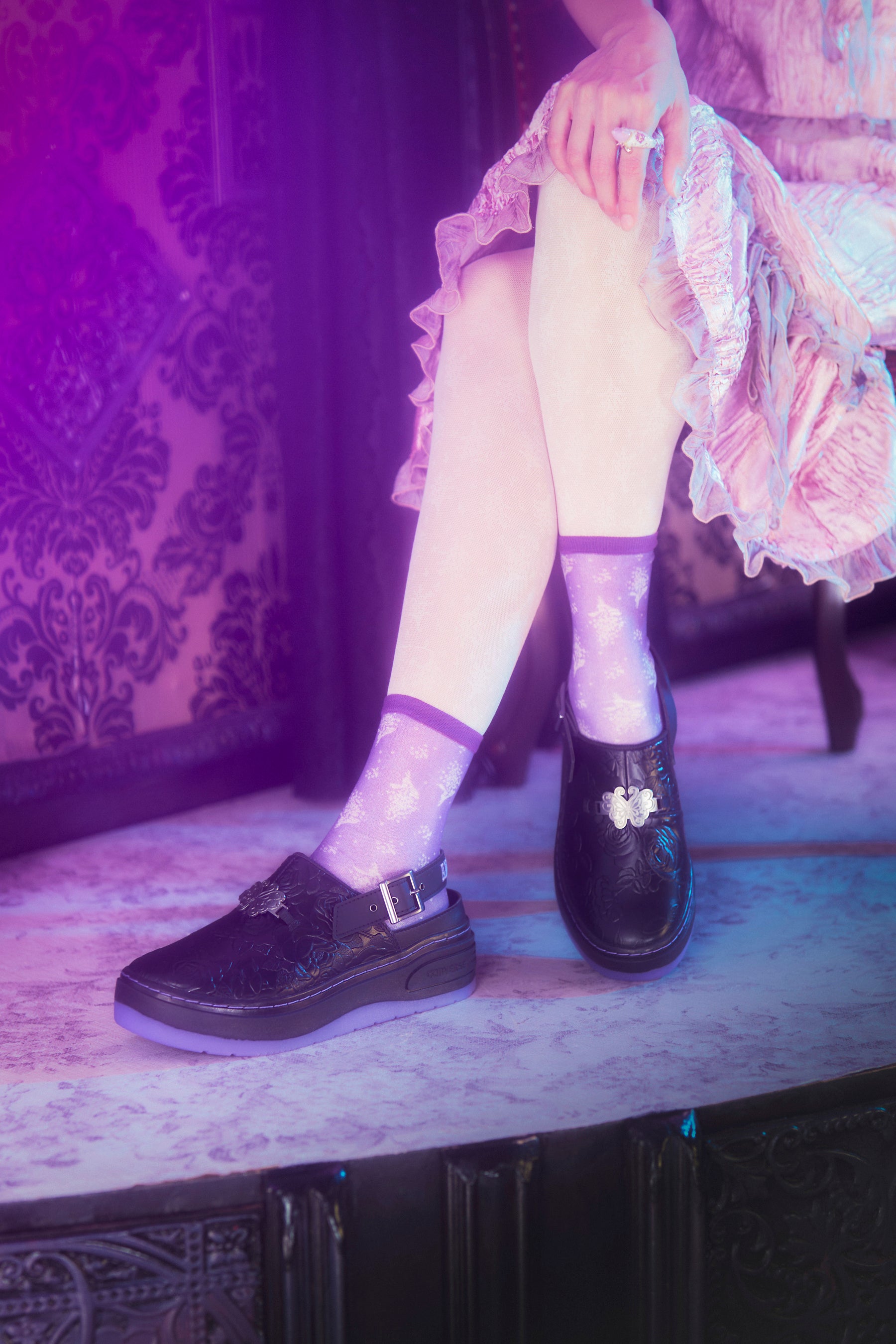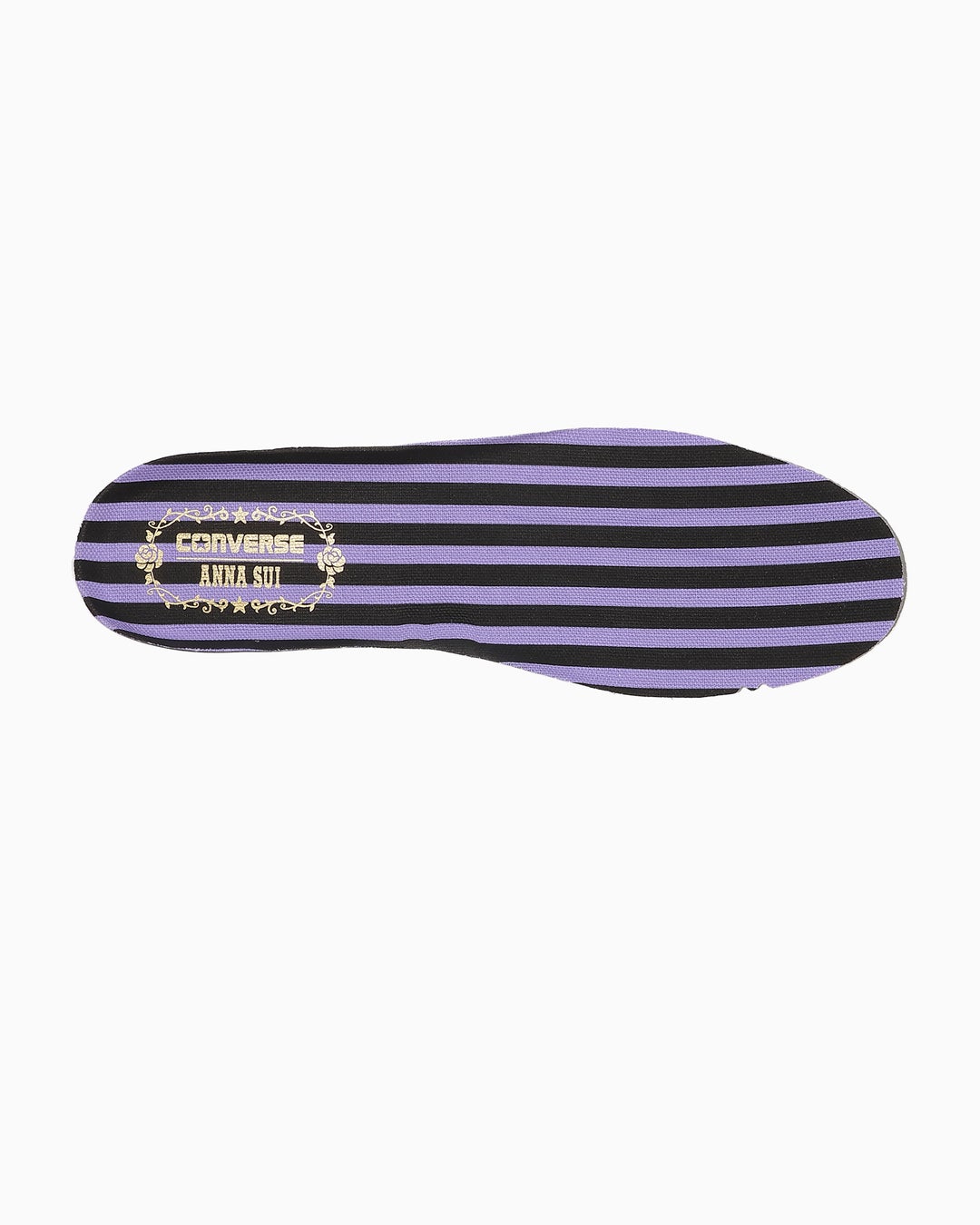 ANNA SUIのイメージカラーでもあるブラック/パープルのカラーリングでまとめ、ブランドのアイコンである蝶や薔薇のモチーフを取り入れました。インソールにはANNA SUIカラーのストライプ柄にダブルネームプリントを施しています。オリジナルのカートン入りです。また、アウトソールにはE.V.A.とラバーを組み合わせることで厚底ながら軽量化を実現しています。