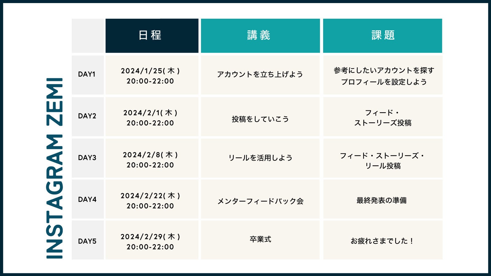 Instagram開設・運用を目指す事業者の方向けの、全5回のオンラインゼミです。