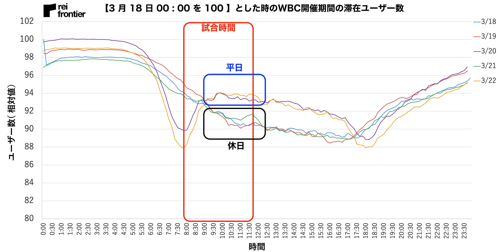 WBC が始まる前の時間帯を見ますと、WBC がある日は滞在数が少ない傾向があります。