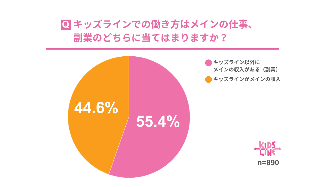 2022年7月にベビーシッターとして活動する890名に実施したアンケートでは、「キッズラインでの働き方はメインの仕事、副業のどちらに当てはまりますか」の質問に対して、「キッズライン以外にメインの収入がある(副業)」と回答したのは、55.4%でした。