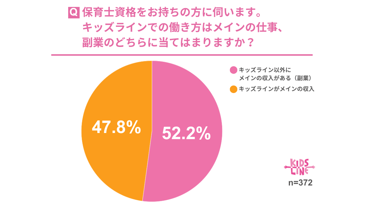 また回答者のうち保育士資格保有者は372名で、そのうちメイン収入がありキッズラインを副業として働いている方の割合は52.2%でした。このことから保育士資格保有者の新たな働き方として、ベビーシッターを副業とする選択肢が広がっていることがわかりました。