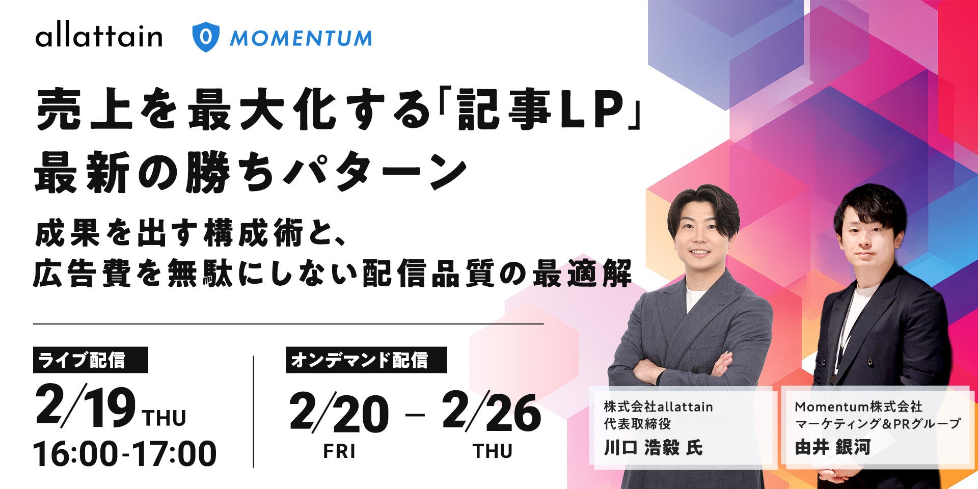 Momentum株式会社(本社:東京都港区、代表取締役社長:細井康平)は、株式会社allattain(本社:東京都豊島区、代表取締役:川口浩毅)と「売上を最大化する『記事LP』最新の勝ちパターン」セミナーを2/19に開催します。