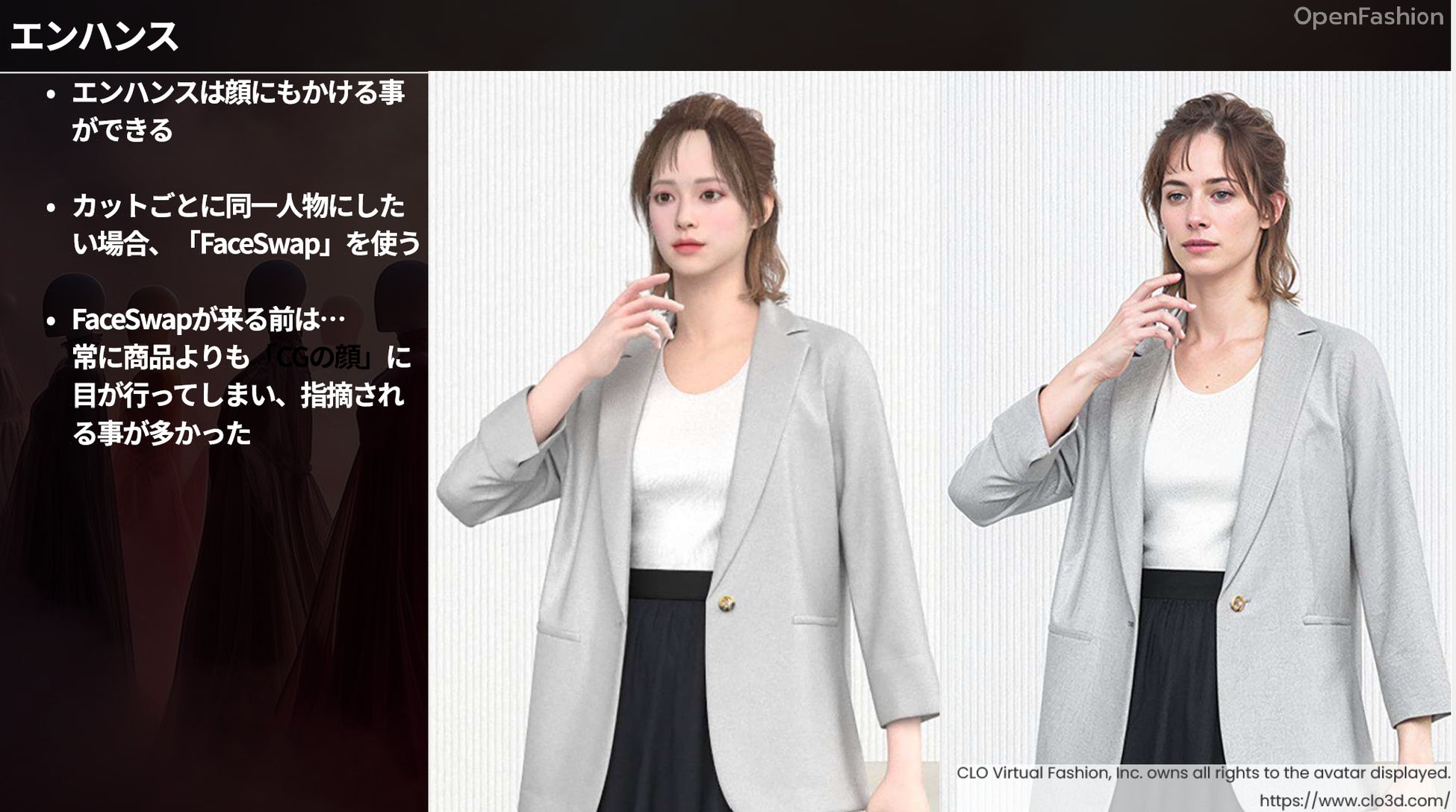 さらに、メタバースでのファッションアイテム展開やアパレルにおける3D CADの活用を通じて、AI技術とCGの融合による新たな可能性を探るほか、具体的な例として、AIを使ったCGの質感表現や、高品質な顔の入れ替え技術などの最新技術も紹介予定です。