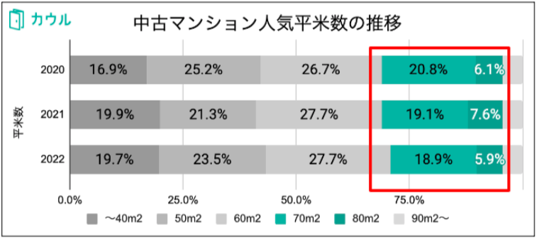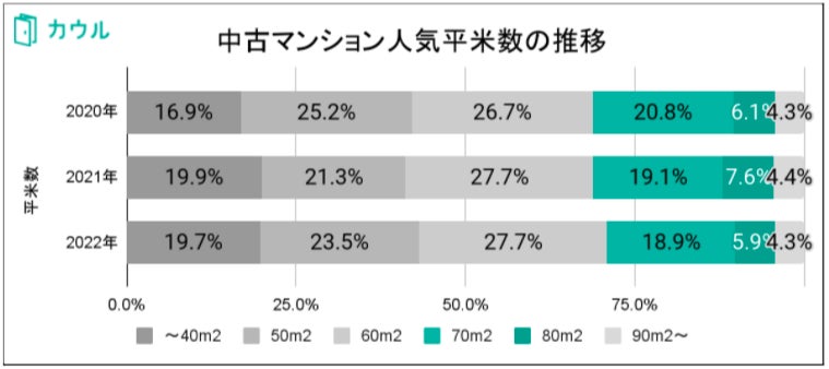- 2022年は2021年に引き続き、60㎡および70㎡の人気が維持された一方で、80㎡の人気が2021年に比べて1.7ポイント下がった。
