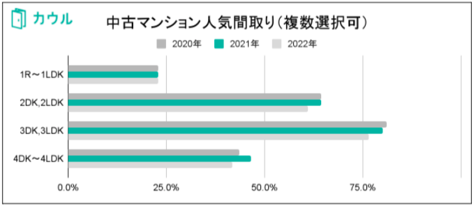 【カウル調査】コロナ前後で中古マンションの人気間取り・広さはどう変わった!? → 3LDK、4LDKの人気が縮小。高騰を続ける中古マンション価格の影響か