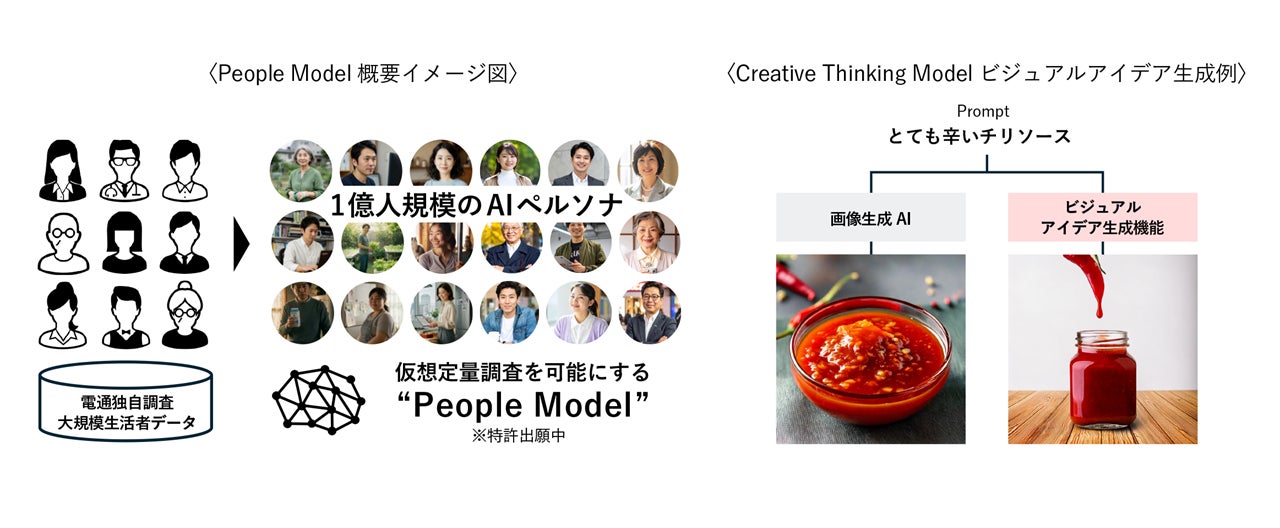 そしてこのたび、「AI For Growth 2.0」のもと、新たに1億人規模のAIペルソナを仮想的に再現する「People Model」を開発しました。また、社内の専門人財(クリエイター、プランナーなど)の知見やアイデア、思考法などを学習させた「Creative Thinking Model(創造的思考モデル)」※3についても、その機能を拡充し、ビジュアルアイデアの生成を可能にしています。これらの概要は次のとおりです。