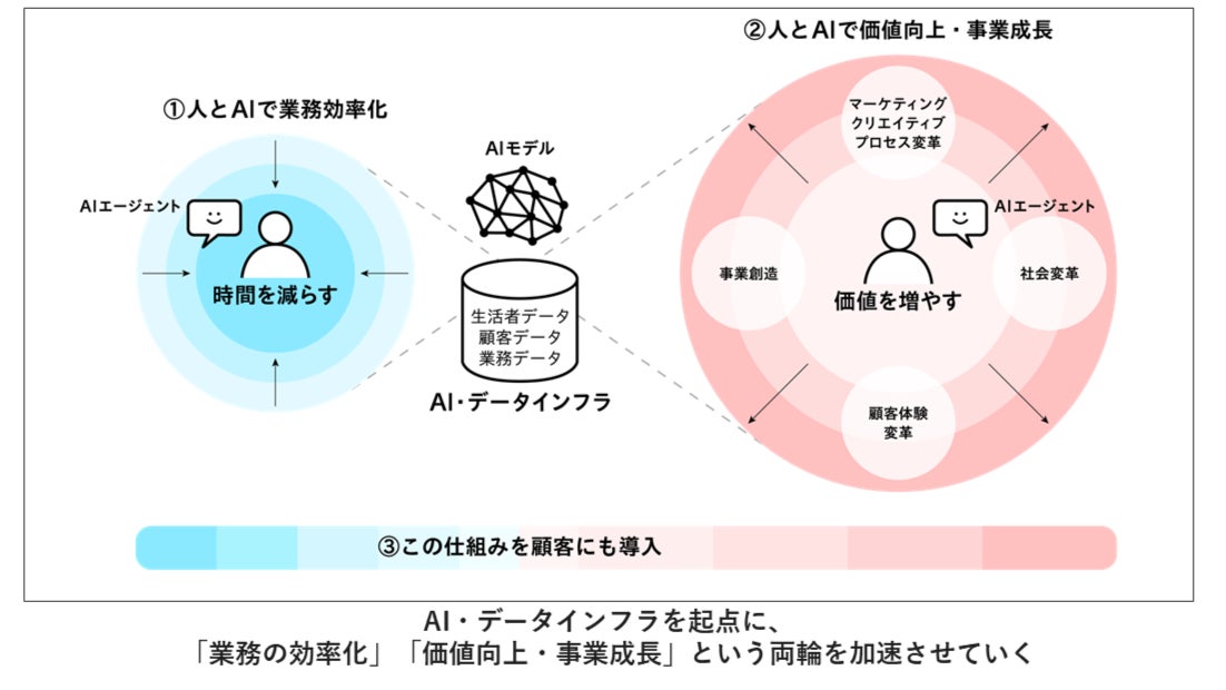 「AI For Growth 2.0」では、独自のAIアセット(大規模調査データや社内の専門人財知見など)とAI技術を融合させた「AIモデル」の深化により、マーケティング手法に革新をもたらし、その全工程をAIエージェントがサポートするマーケティング領域の「AIネイティブ化」を目指します。これにより「業務効率化」と「価値向上・事業成長」の両輪で顧客や社会の持続的な成長に貢献していきます。