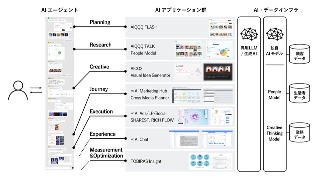上記2つの独自AIモデルの構築に加え、電通の「AIQQQ FLASH」「AIQQQ TALK」、電通デジタルの「∞AIⓇ」、両社の「AICO2」などのAIアプリケーション群とデータの連携を図ることで、ユーザーとの対話を通じて自律的に最適な答えを導き出す「統合マーケティングAIエージェント」の開発にも取り組んでいます。このAIエージェントは、電通グループ内での活用にとどまらず、今後は顧客向けにも提供していく予定です。