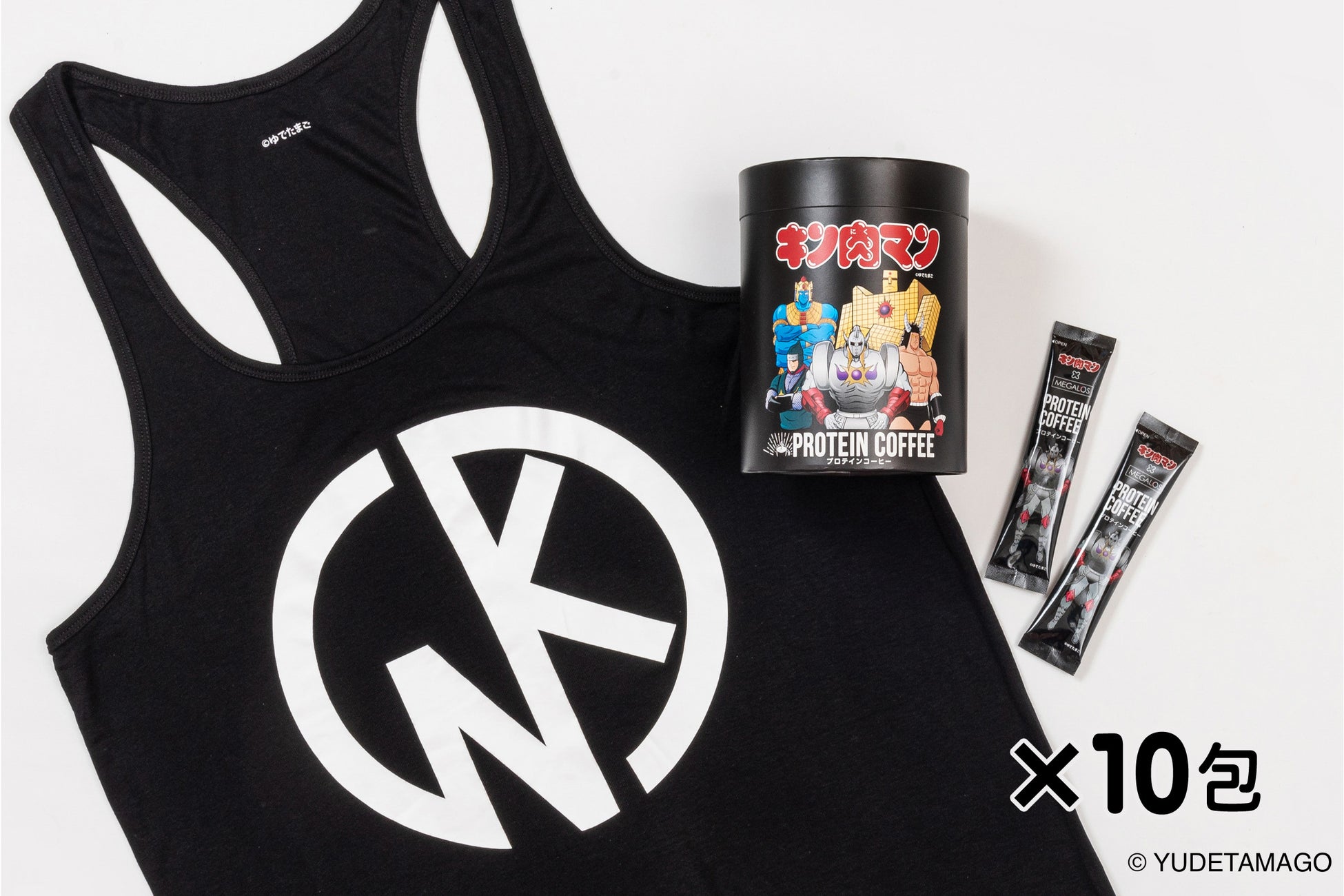 今回、キン肉マン特別パッケージ「悪魔超人Ver.」の PROTEIN COFFEE 30包入りタイプのほか、キン肉マン「KINマーク」デザインのタンクトップ(ブラック)入りの限定版10包入りタイプも数量限定にて展開します。