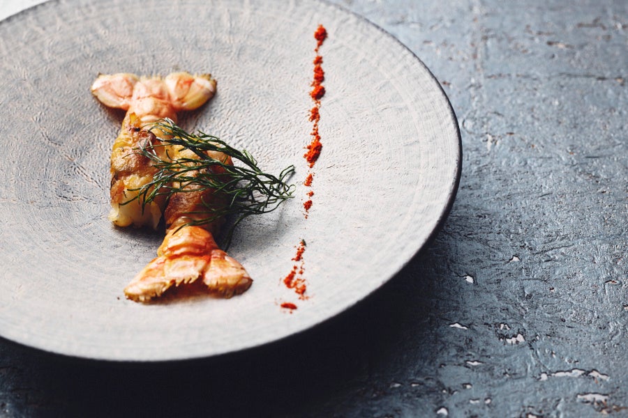 - ⽜脂を纏(まと)った⼿⻑海⽼のソテー レッドチリペッパーとディル