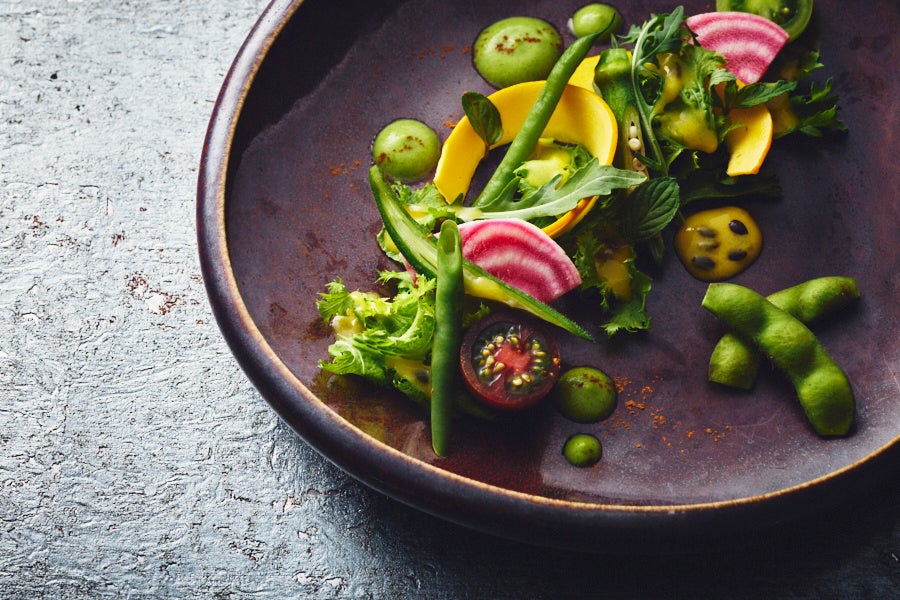 ヴィヴィットカラーの夏野菜をたっぷり。パッションフルーツだけの酸味で、そのままの美味しさが味