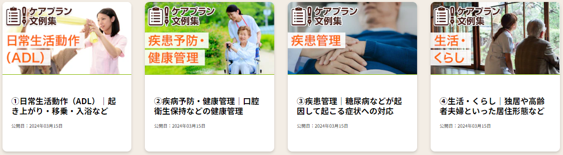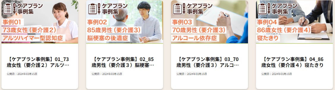 ケアマネージャー向けのコンテンツです。文例集は、ケアプラン計画書などの書類作成に参照できるもので、言い回しに迷った際に利用できるのはもちろん、支援方法のアイデア出しにも活用できます。事例集は、具体的なケースから課題抽出・目標設定を学ぶことができます。介護事業者が実際に担当している利用者との状況に近い部分があれば、より参考になる記事となっています。