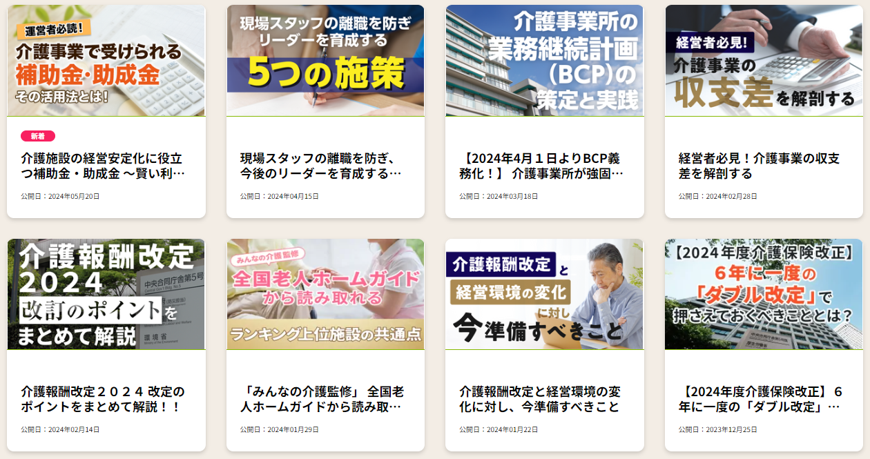「経営オンライン」では、「みんなの介護」のサービスから得た現場の⽣の声やデータを元に、介護事業の経営者に向けたマーケティングデータをまとめていて、経営の現状や今後に向けての記事をシリーズで連載中。施設の閉鎖も多い介護業界へのソリューションとして機能し、多くの事業者に読まれています。