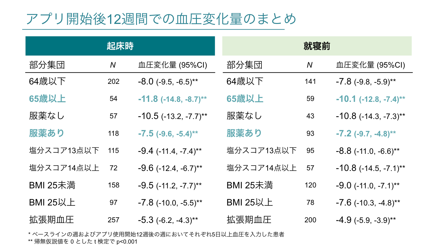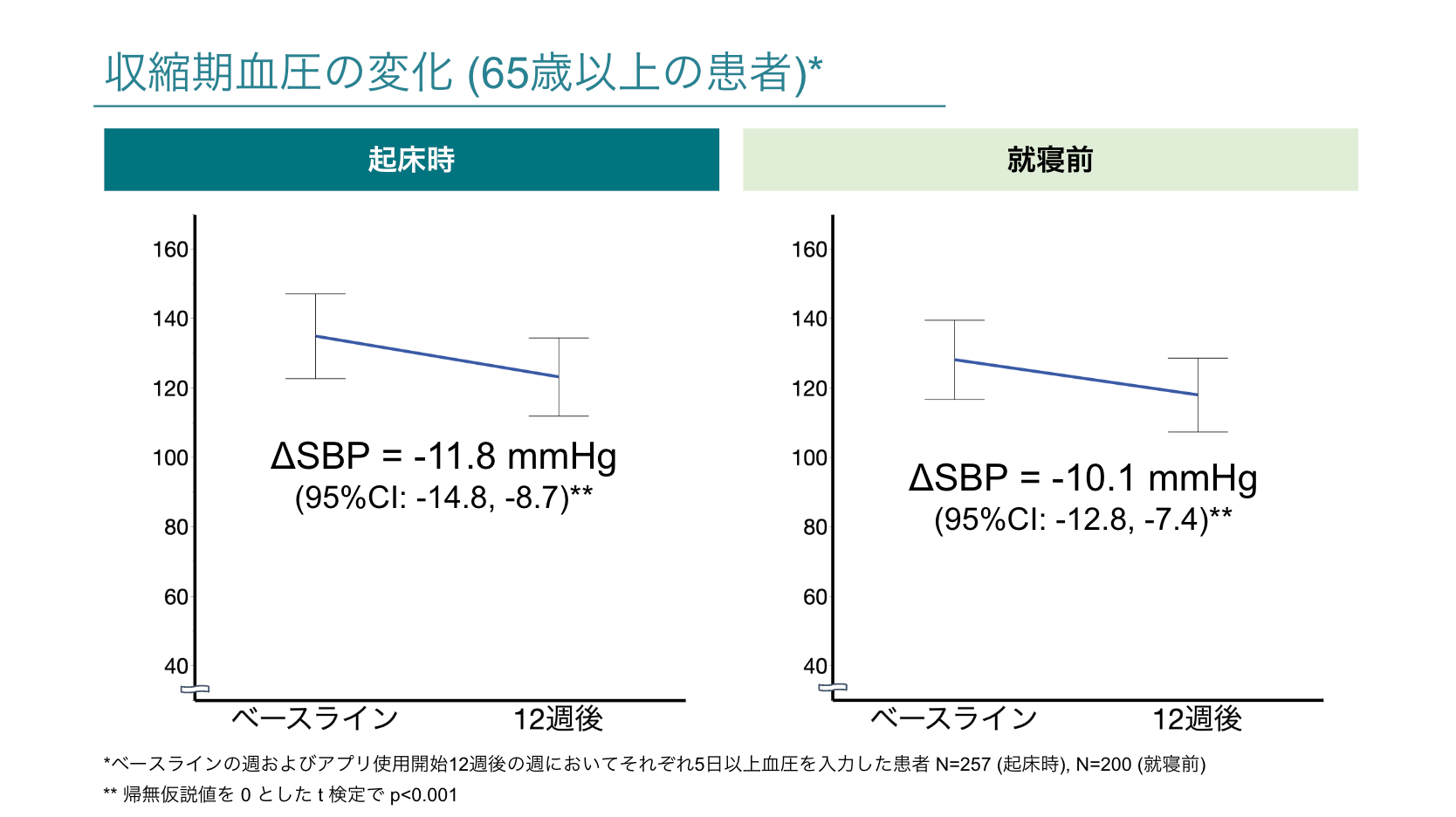 保険適用の「高血圧症向け治療アプリ」を用いたスマート降圧療法〜65歳以上の高齢者においても継続可能、12週後の起床時収縮期血圧で-8.8mmHgの降圧を確認〜