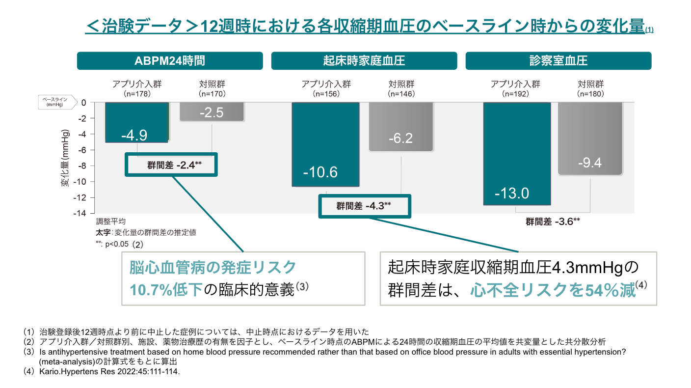 高血圧症向け治療アプリの治験では通院のみの群と通院に治療アプリを追加した2群で血圧値を評価。登録後12週時点におけるアプリを使用した患者の家庭での収縮期血圧において、起床時収縮期血圧は-10.6mmHg、就寝前収縮期血圧は-8.5mmHGで、アプリを利用していない群との群間差は起床時で -4.3 ㎜Hg、就寝時で-3.6㎜Hgあり、この効果は登録後24週まで持続しました。*2本邦の心血管リスクのある患者を対象としたJ-HOP研究*4では、起床時の家庭収縮期血圧は脳卒中の独立した危険因子であるとされており、10 ㎜Hgの増加で脳卒中リスクが36%増加するとされています。治験時での本治療アプリによる起床時の家庭収縮期血圧の約10 ㎜Hgの低下は、心血管疾患を減少させる臨床的意義があると共に今後の高血圧治療における治療方法の選択肢の1つとして有効であることを意味付ける結果となりました。