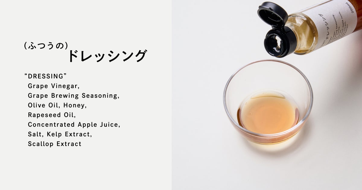 シェフがレストランで実際に提供している手作りドレッシングを忠実に再現するため、酸味がまろやかなぶどう酢、白ワインを煮ることでワインの風味を立たせ、ホタテエキスや昆布エキスを加えることでコクとうま味、さらにりんご果汁で甘みが立つように調合。甘味、酸味、塩味、うま味、全てが調和する1つの味を立たせない味わいと、さらりとしたオイルのようななめらかさを併せもちます。サラダを決してドレッシング味にせず、コンビニで買った野菜でも、素材そのままに高級店の味わいに早変わりさせる逸品です。