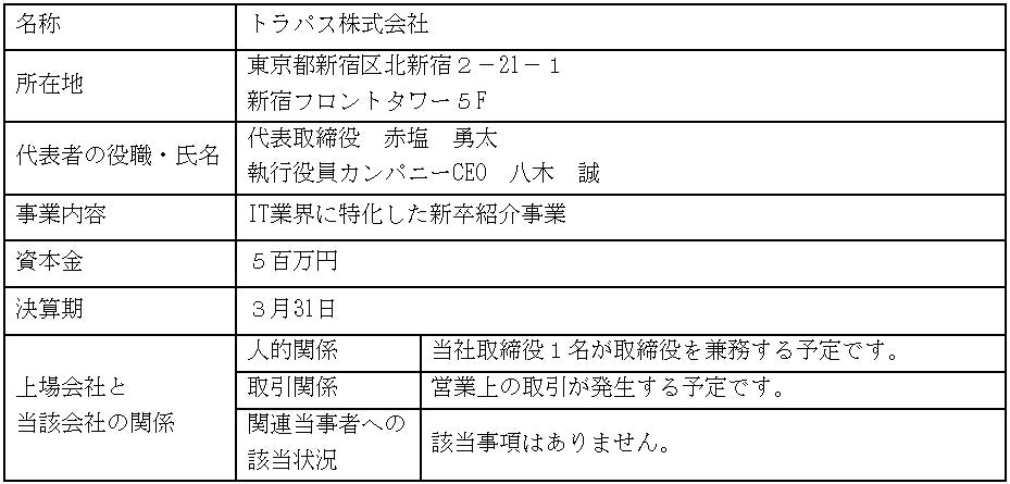 当社において既に理系専門の人材紹介サービスのチームを立ち上げており、理系人材の人材紹介 件数の拡大を図っておりますが、既存の理系専門チームでは理系全般での人材紹介となります。一 方、今回設立したトラパスにおいては、みん就のクライアント企業であるSIer、WEB企業などを中心 としたIT業界に特化した人材紹介サービスを提供していく予定(有料職業紹介事業許可申請予定) で、当社グループとして初の業界特化型の人材紹介サービスになります。