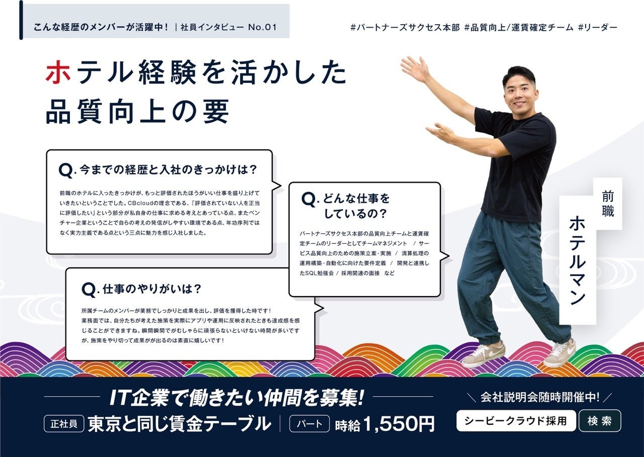 CBcloudでは、沖縄から全国に価値を提供する機会を創出し、東京と同等の給与テーブルを設定することで社員一人ひとりの価値を正当に評価し、多様な職種を通じて成長できる環境を構築しています。