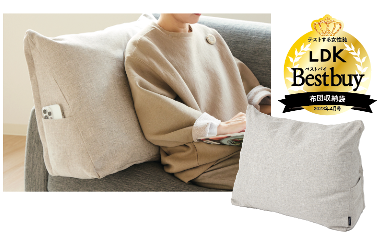 使わない布団を中に入れるとクッションになる収納袋。三角の形状はかわいさと同時に、背中に沿うようにフィットするので心地よさも感じます。ケースのサイズが小さめなので、弾力もしっかりあります。