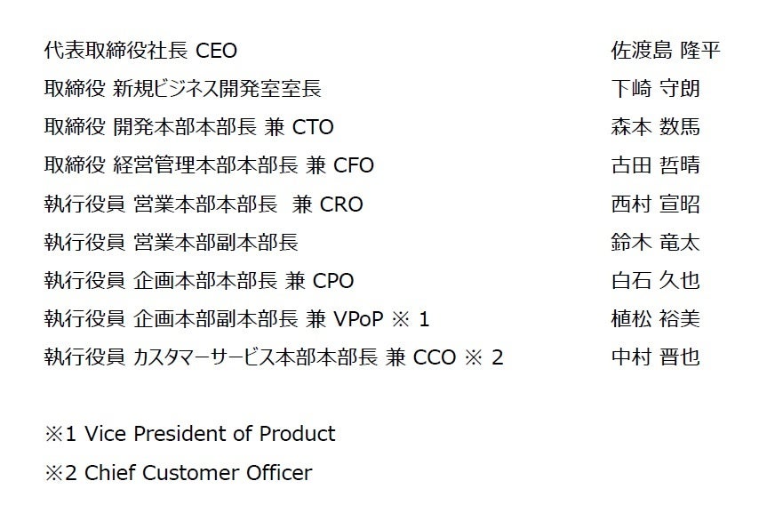 この度の新組織体制では、各営業部およびマーケティング部等を含む営業本部を管掌するCRO(Chief Revenue Officer)と、当社製品、サービス企画を担う企画本部を管掌するCPO(Chief Product Officer)を設置し、新たに下記2名が就任します。