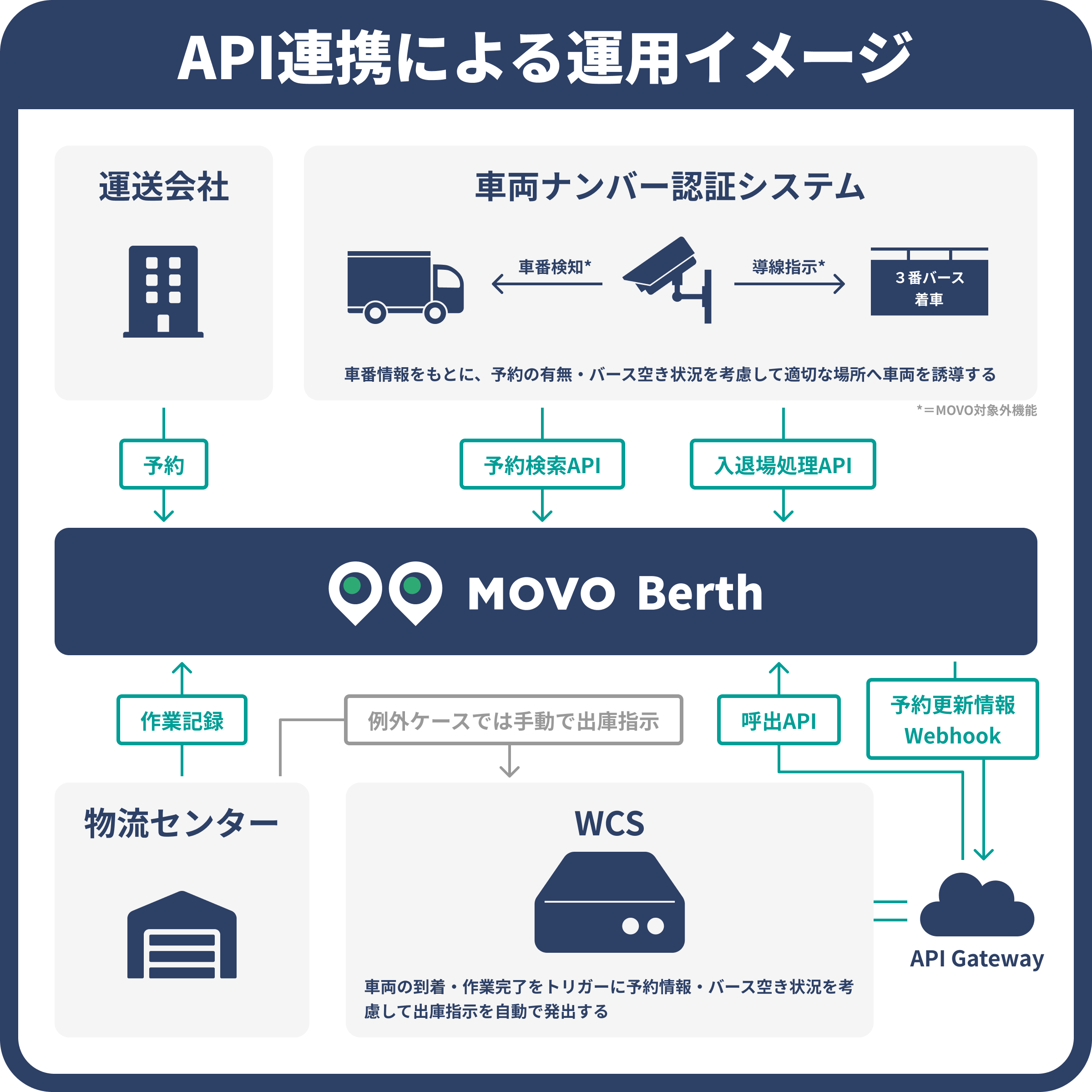 MOVO Berthを車番認識カメラ・ゲートシステム(※3)・倉庫制御システム(WCS)等と連動させることで、より高度な倉庫運営を支援します。