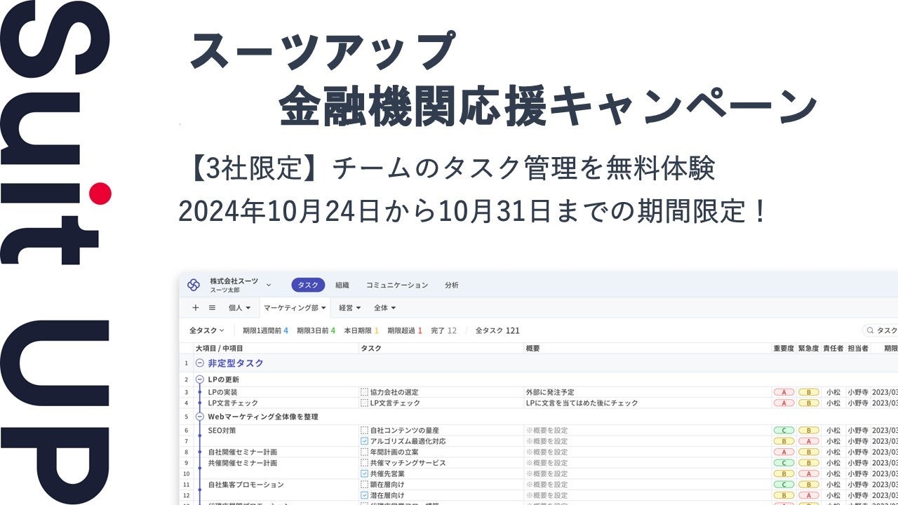 株式会社スーツ(所在地:東京都千代田区、代表取締役社長CEO:小松 裕介)は、チームでかんたん、毎日続けられるプロジェクト・タスク管理ツールの経営支援クラウド「Suit UP」(スーツアップ)において、地方銀行、信用金庫及び信用組合等向けに金融機関応援キャンペーンを実施いたします。