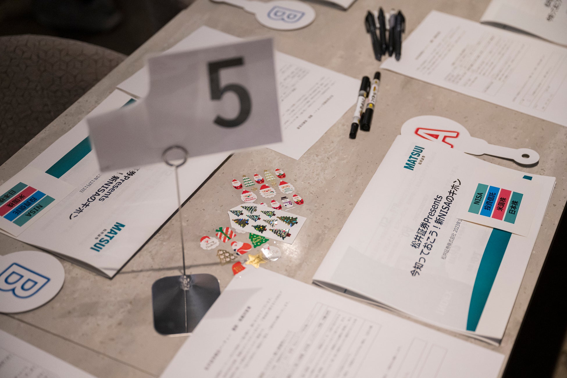 投資をしている方や、新NISAに興味のある方などを中心に計40人の方の参加があり、松井証券による新NISAのセミナーや、参加者同士でお金の話ができるグループ交流を実施。グループ交流では、交流コンテンツに沿ってお金やライフプランに関する会話が多く交わされました。