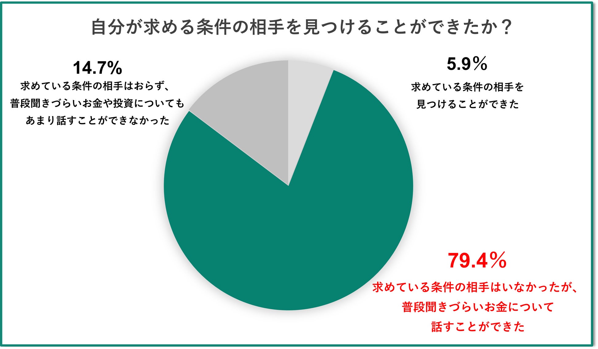 また『このパーティーに参加したことで、自分が求める状況の相手を見つけることができたか』という質問については、「求めている条件の相手は見つからなかったものの、普段聞きづらいお金について話すことができた」と答えた人が約8割にも。