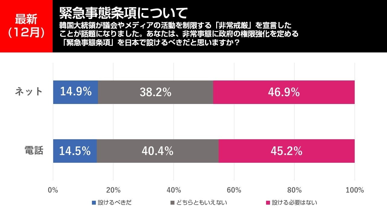 「韓国大統領が議会やメディアの活動を制限する『非常戒厳』を宣言したことが話題になりました。あなたは、非常事態に政府の権限強化を定める『緊急事態条項』を日本で設けるべきだと思いますか?」と聞いた結果が上の図です。