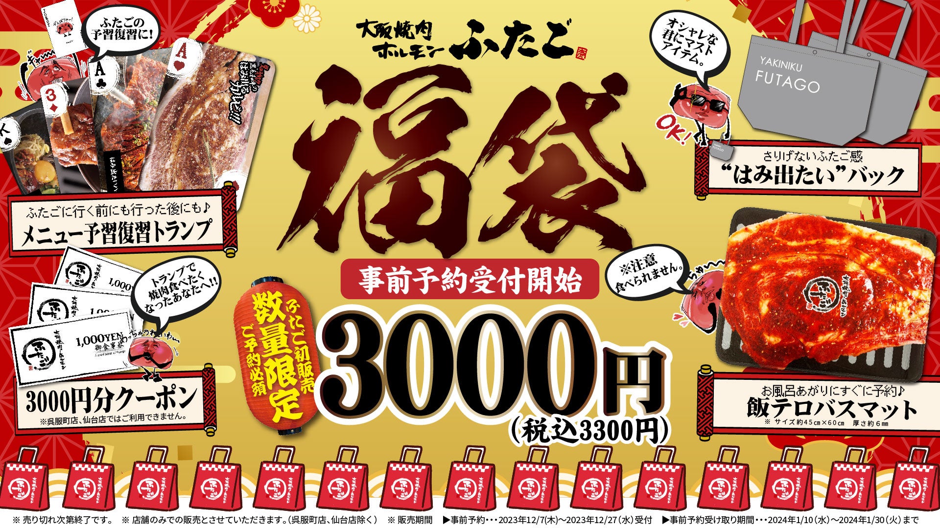焼肉ふたごが初めて販売する福袋は、買ったら絶対に焼肉が食べたくなる飯テログッズと、F-POINTアプリお食事クーポンが1,000円分×3枚ついてくるとてもお得で楽しい福袋です!
