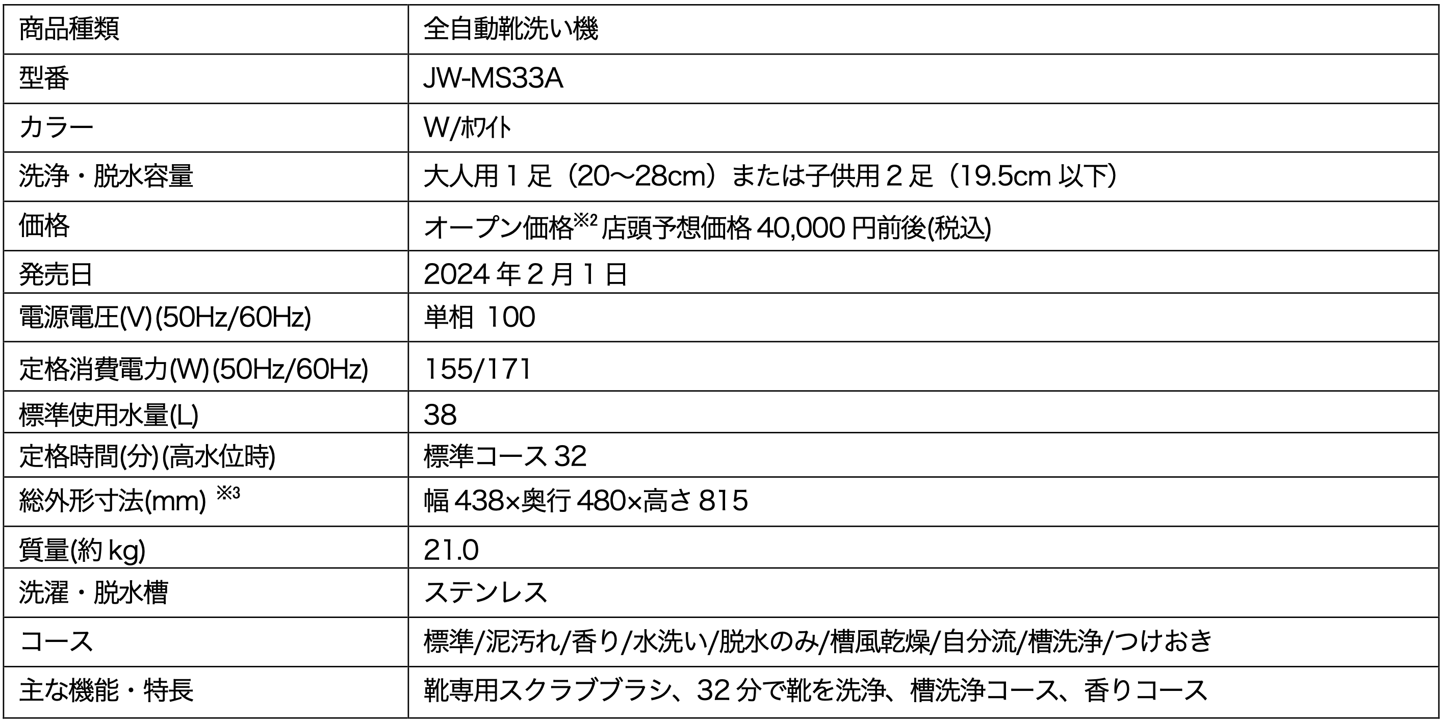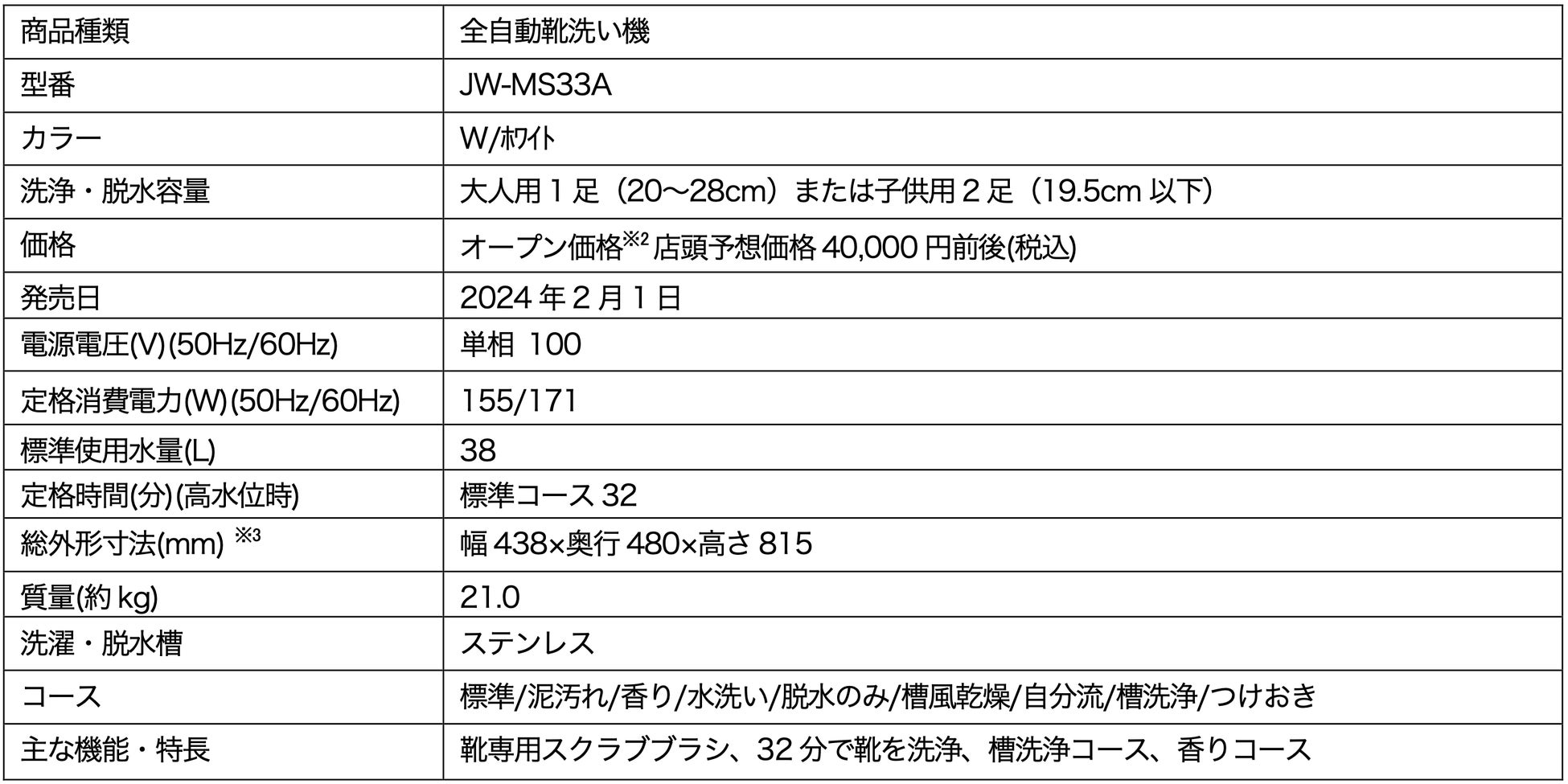 家庭用全自動靴洗い機(JW-MS33A)の概要は以下の通りです。