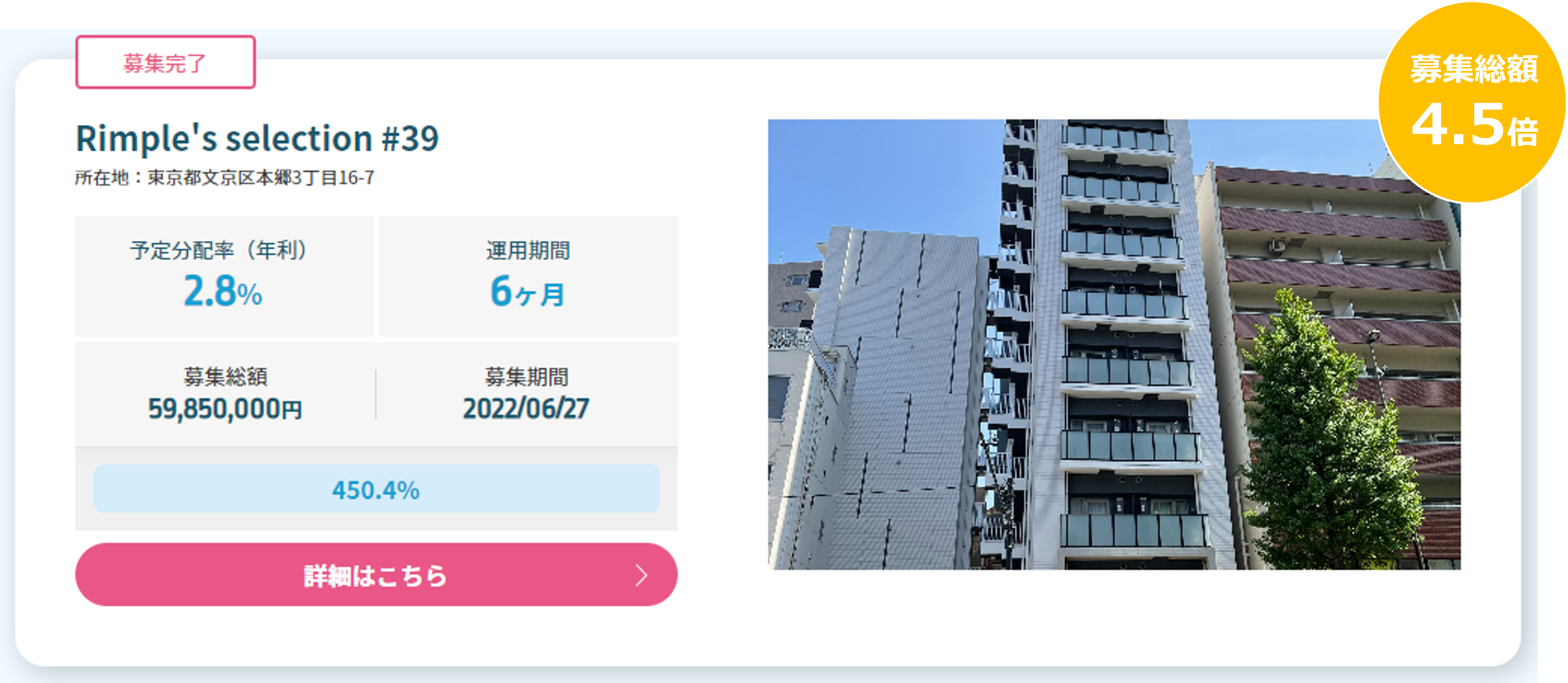 Rimple’s Selection#39募集総額450.4%の2.69億円の応募
