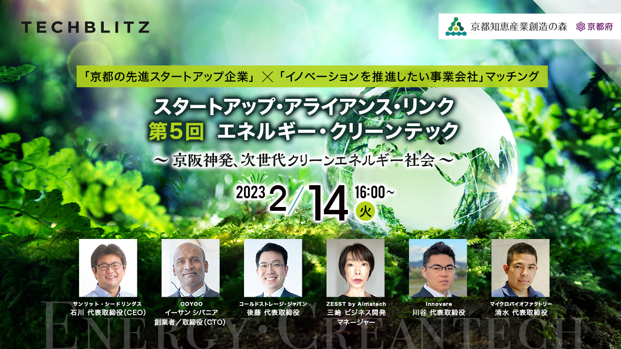 イシン株式会社(本社:東京都新宿区 代表取締役社長:片岡 聡)は、「一般社団法人 京都知恵産業創造の森」「京都府」と共に2月14日(火)にピッチイベントを開催します。エネルギー・クリーンテック分野の京阪神発スタートアップ企業7社が登壇し、将来のビジネスパートナーに向けてプレゼンテーションを行います。