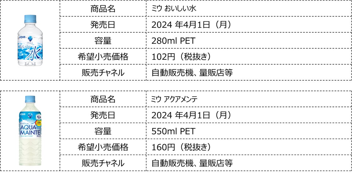 ダイドードリンコ株式会社(本社:大阪市北区、代表取締役社長:中島 孝徳)は、2024年春夏の新商品として、「ミウ おいしい水」小容量タイプと、スポーツドリンク「ミウ アクアメンテ」を4月1日(月)より発売いたします。