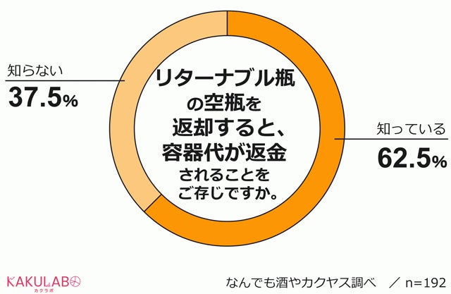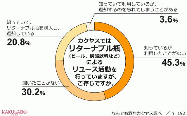 こうしたカクヤスのリユース活動を知っているかを聞いてみたところ、「知っている」と回答した人は70%、このうち「知っていて利用している」人は24%でした。つまり、およそ4人に1人はリターナブル瓶の商品を購入していることになります。