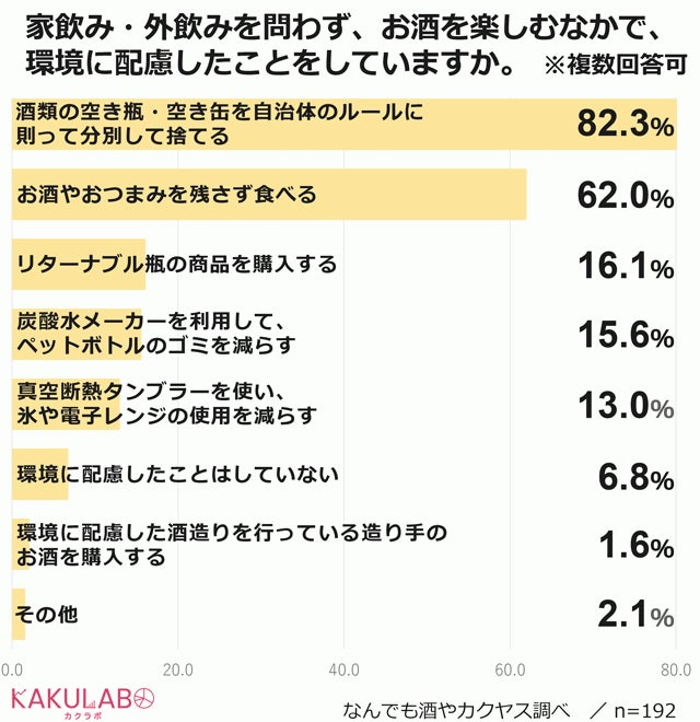 今回、家飲み・外飲みを問わず、お酒を楽しむなかで、環境に配慮したことを行っているかについても複数回答可で聞いてみました。