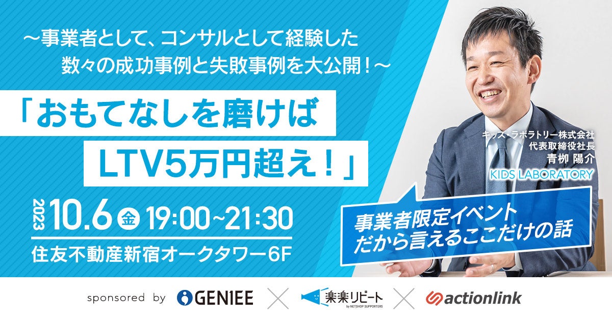 といった様々な経験をお持ちのキッズ・ラボラトリー株式会社 代表取締役 青栁氏をお招きして、「LTV」をテーマにした事業者限定のリアルイベントを開催します。