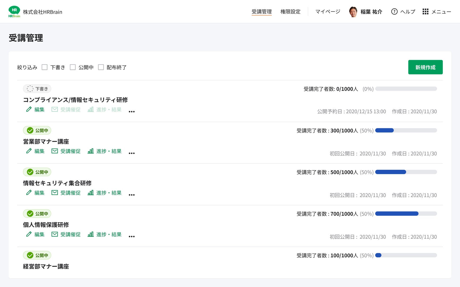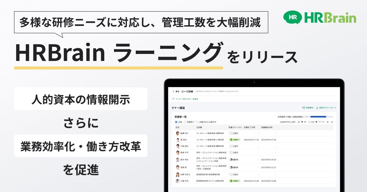 株式会社HRBrain(本社:東京都港区/代表取締役CEO:堀 浩輝 以下、当社)は、運用しやすいUI設計で多様な研修ニーズに対応し、進捗管理を一元化。大幅な工数削減を実現するLMSとして『HRBrain ラーニング』の提供を開始しました。