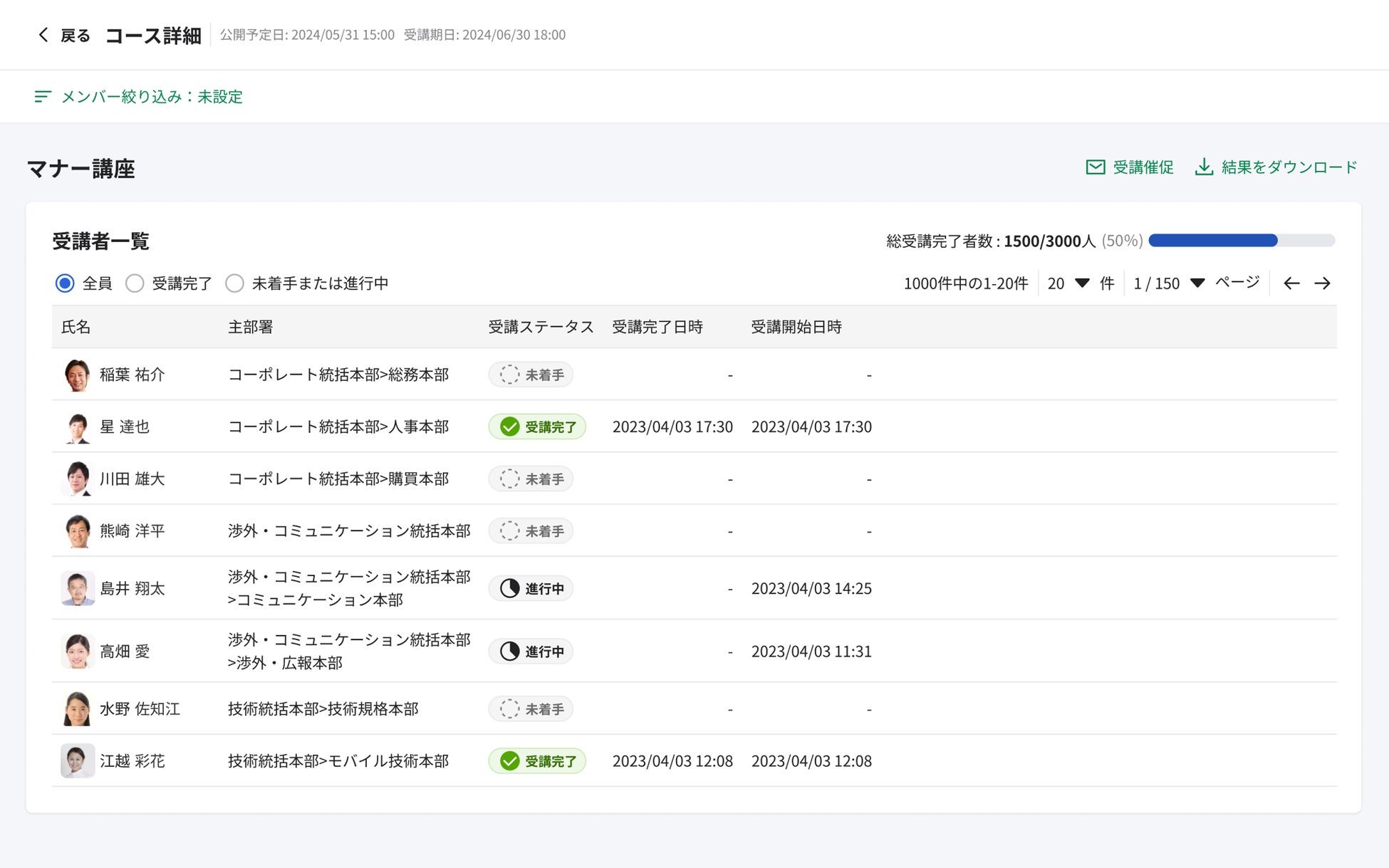 受講率やテスト結果のダウンロードも手軽に行え、上層部への報告資料作成も効率化。