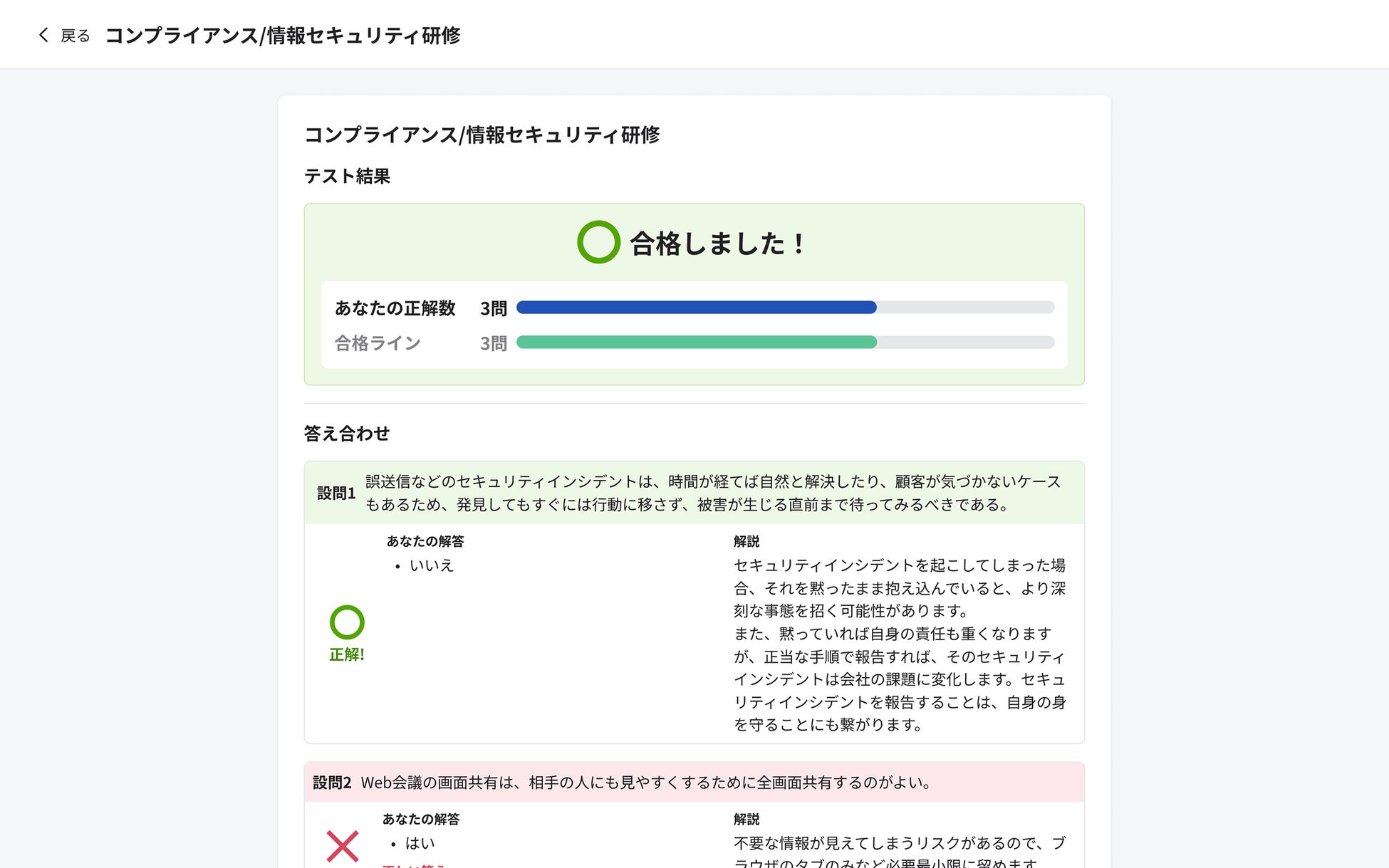 コンプライアンスチェックの確認テストから、スキル研修後のレポート提出、アンケート回収まで、一つの画面で完結。
