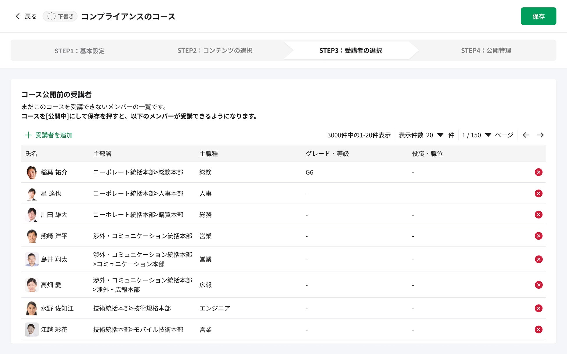 部署や職種など様々な属性をもとに、受講者を柔軟に設定。