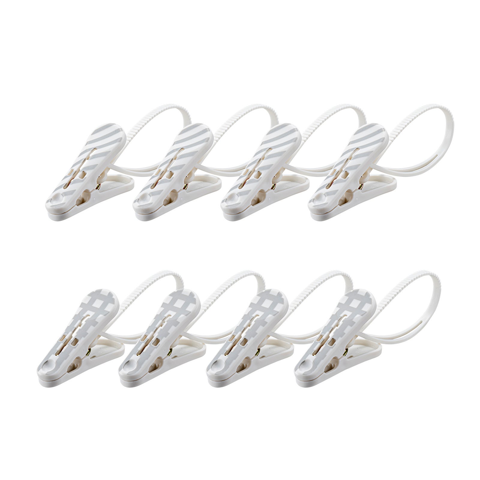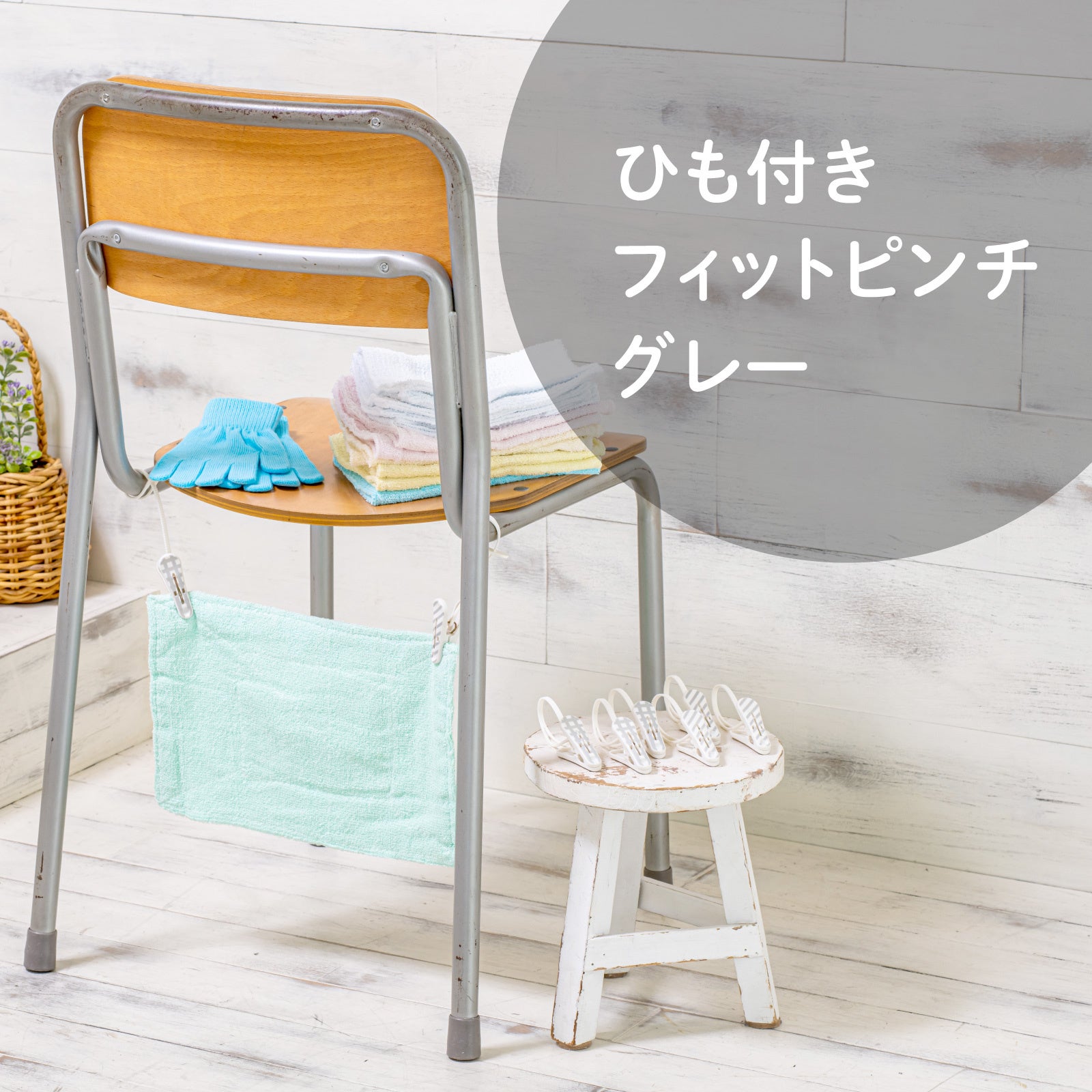 『ひも付きフィットピンチグレー』は物干し竿に固定しやすいひもが付いたピンチです。椅子にも簡単に固定でき、ストライプとチェックの可愛い2種類の柄入りなので、小学校の雑巾ピンチにも最適です。洗濯物や雑巾がすべりにくいように先端に半球状の突起をつけています。また、クローゼットで帽子や手袋など小物収納、キッチンでゴム手袋や布巾、お菓子の袋止めなどさまざまに使えます。つまみ部分を大きくして指先にフィットするくぼみを持たせることにより、つまみやすくて力が入りやすいユニバーサルデザインになっています。