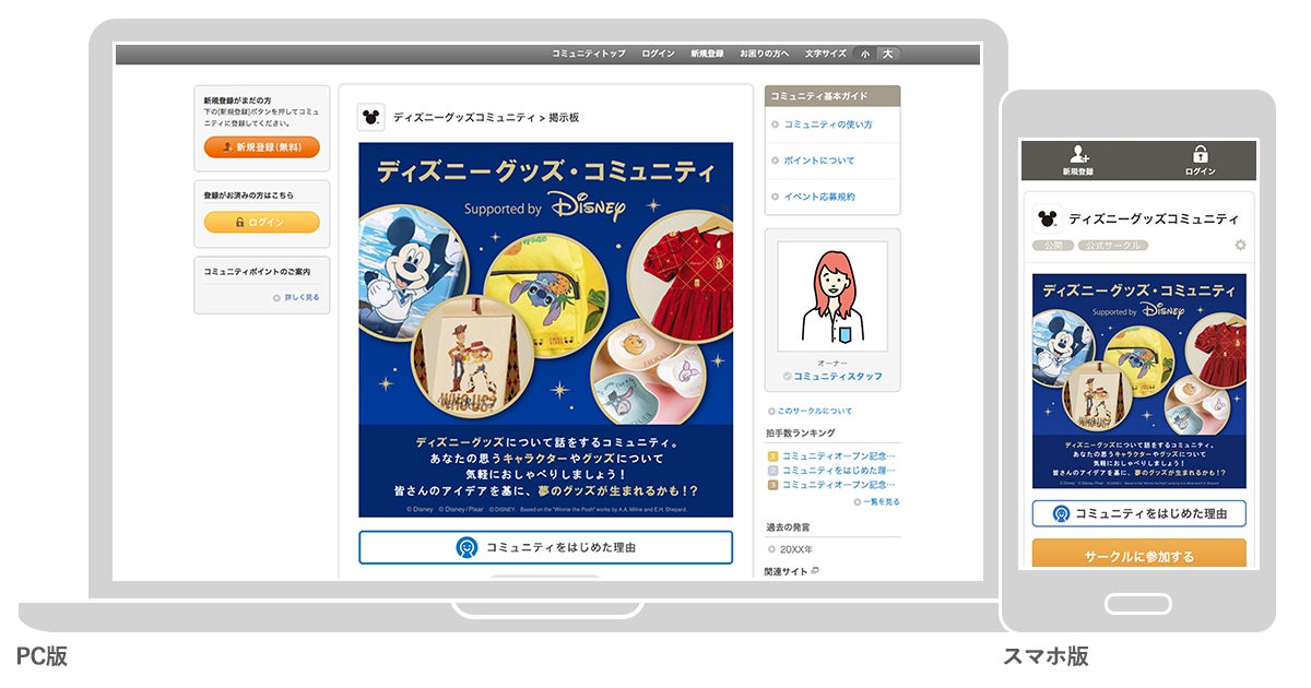 本コミュニティは、ディズニーグッズを愛する方なら、どなたでも無料で参加できるオンラインコミュニティです。参加者は、自分が好きなキャラクターや、身に着けたい、身近に置きたいグッズについて、他の参加者と楽しく対話することができます。参加者の「あったらいいな」の声が、未来のディズニーグッズのアイデアにつながる可能性も!?