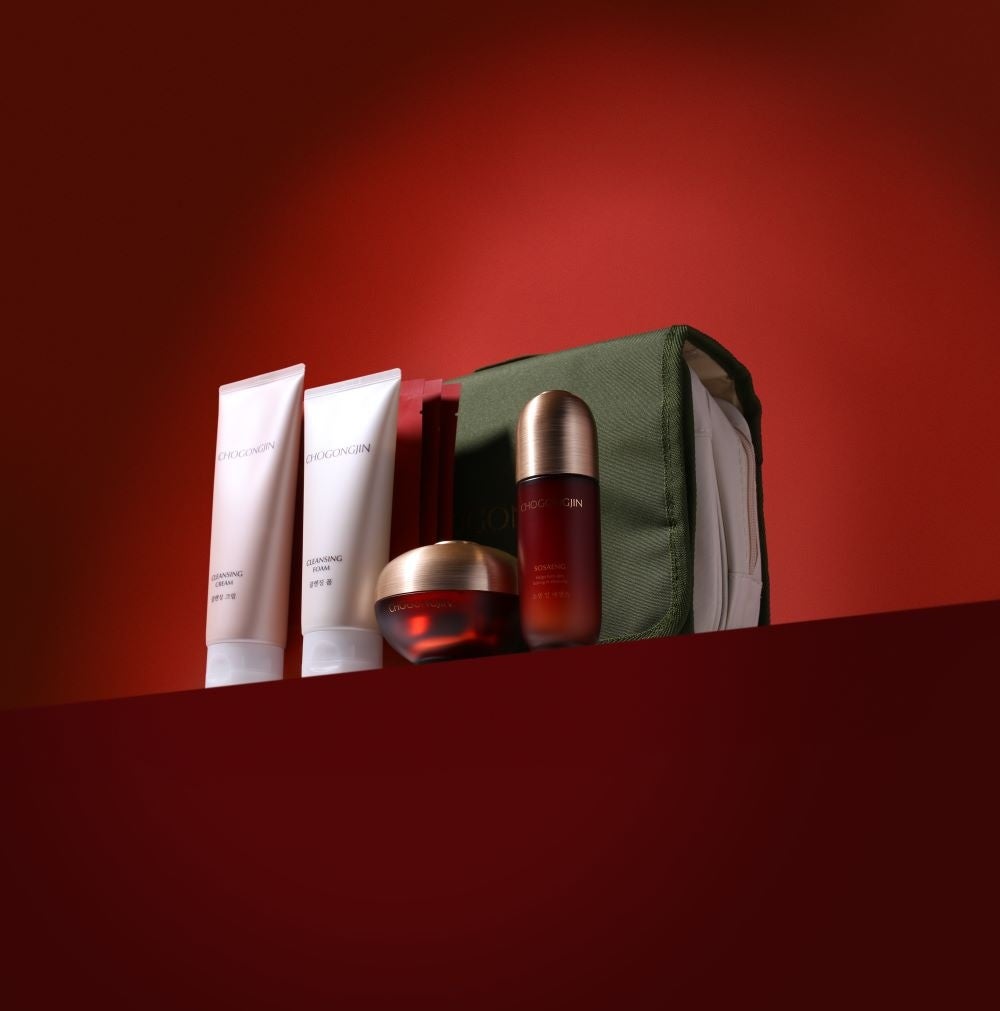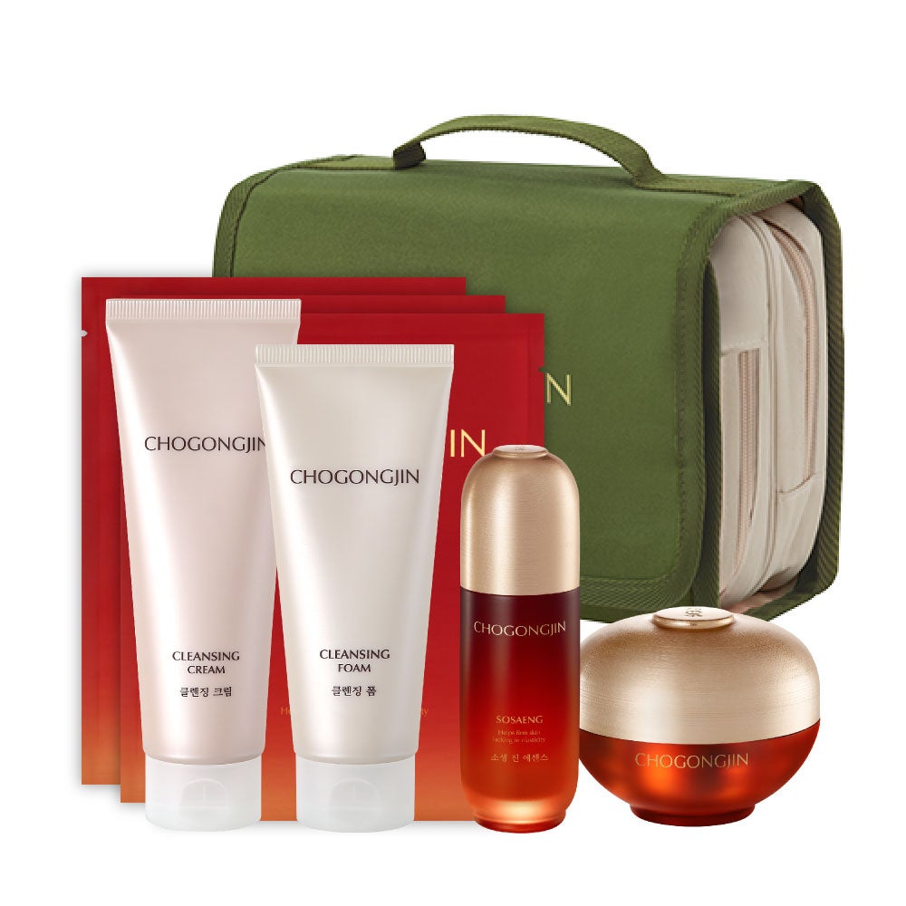 チョゴンジン ソセンシリーズは紅参*1 と発酵コラーゲン*2 の力でハリと弾力感のある肌を目指すエイジングケア*3 シリーズ。そんなソセンから人気スキンケア3品とコフレ限定クレンジングアイテム2品がセットに。濃密な使用感のシートマスク、美容液とクリームでいつものスキンケアを極上のひとときに。限定アイテムのメイク落としと洗顔フォームは高密度な使用感でうるおいを守りながら、汚れや古い角質をオフします。さらにチョンゴジンオリジナルデザインの豪華3段トラベルポーチがノベルティに。吊るして使えるトラベルポーチなので、旅先でもチョゴンジンとともに贅沢なスキンケアタイムをお過ごしいただけます。