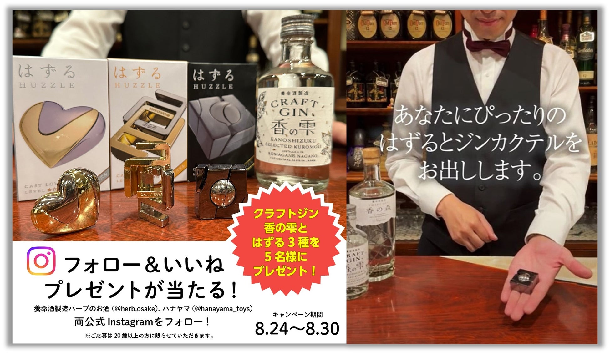 応募方法:養命酒製造ハーブのお酒[@herb.oake](https://www.instagram.com/herb.osake/ )と、ハナヤマ[@hanayama_toys](https://www.instagram.com/hanayama_toys/ )をフォローし、プレゼントキャンペーン告知の固定投稿(https://www.instagram.com/p/CwT8qLxykp1/?igshid=MzRlODBiNWFlZA== )に「いいね」をして応募完了。