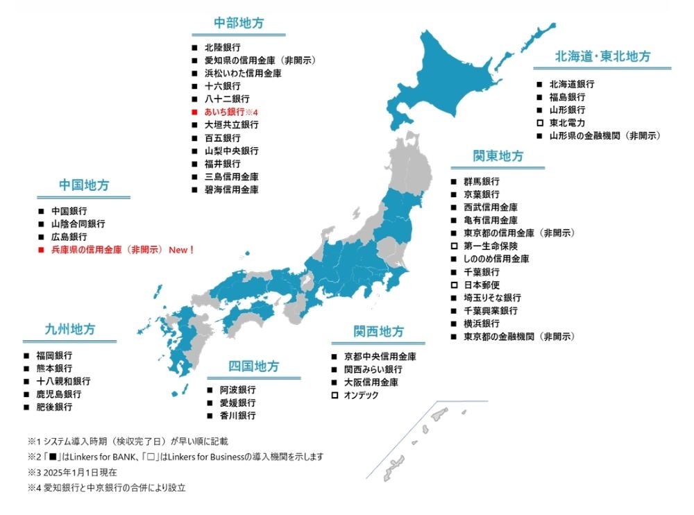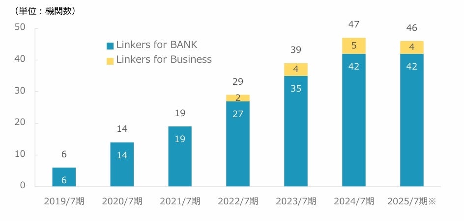 サービス提供開始以降、地域金融機関や信用金庫を中心に全国で 46 機関(*1、*2)に導入されており、そのネットワークは順調に全国に拡大(*1、*3)しております。「Linkers for BANK」を導入した地域金融機関並びに信用金庫全体では、これまでに約 30 万件(*1、*4)のマッチングの商談を創出し、地元企業の商談機会の増加による収益機会の拡大など地域経済の活性化に貢献しております。