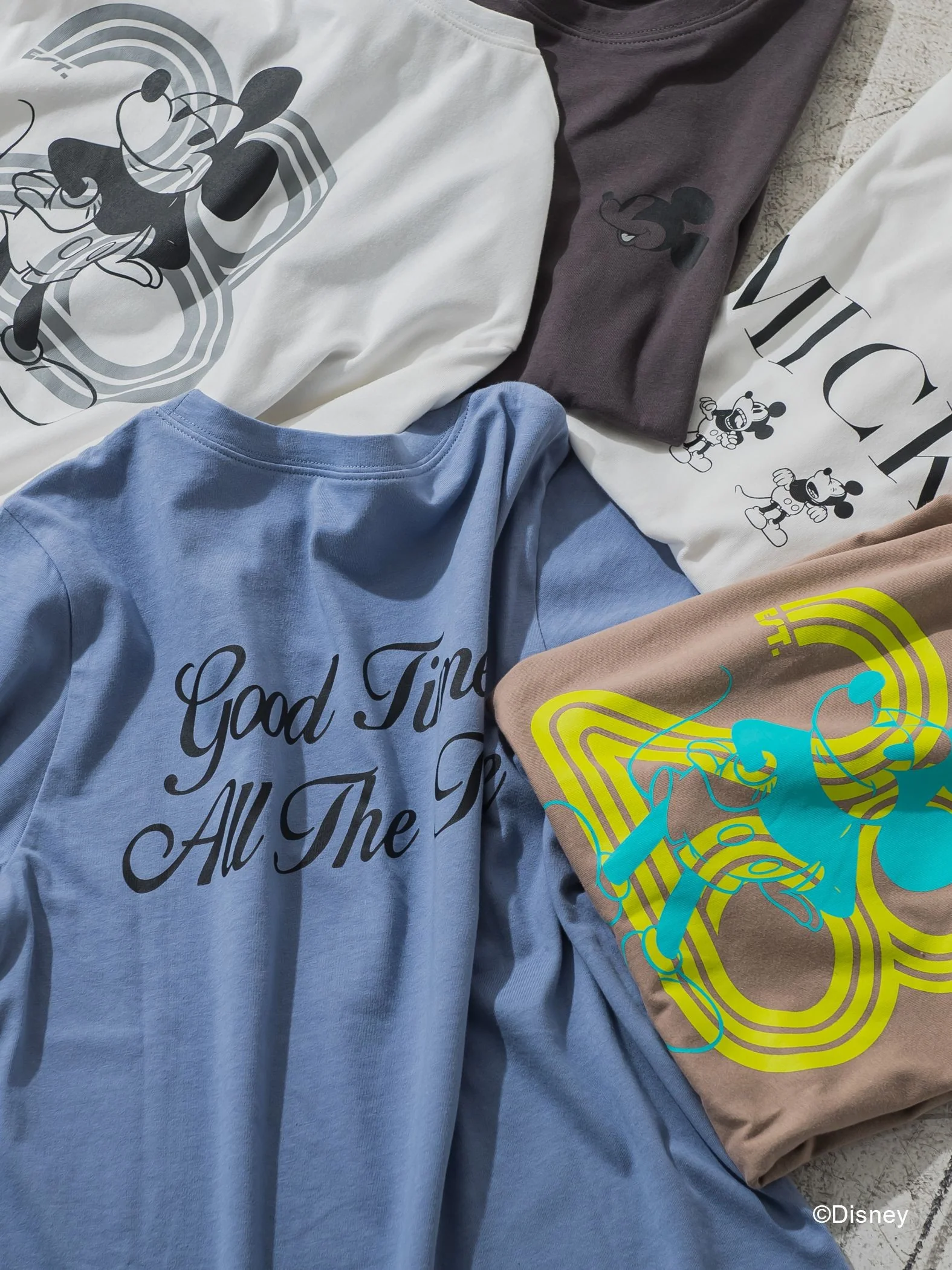 定番のミッキーマウスが映えるデニムスタイルからジレやベストと合わせるトレンドスタイルまで。デイリーに活躍するデザインTシャツが、カラフルで爽やかな夏らしい色使いで新登場。