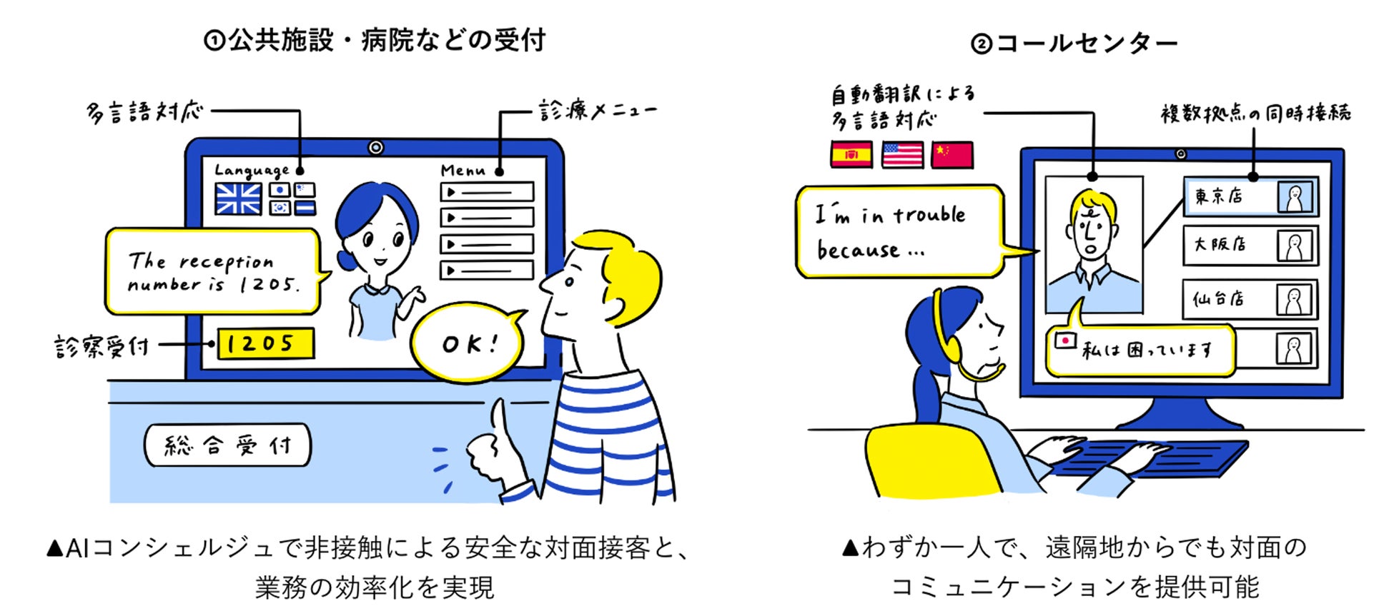 観光施設やホテル、外国人旅行者が多く訪れる店舗で、さまざまな言語で受付接客をすることができます。WEBテレビ電話を介した会話の自動翻訳により、日本人オペレーターがリアルタイムに翻訳された結果をもとに会話をすることができます。現在(2023年9月1日時点)、14か国語に対応しています。